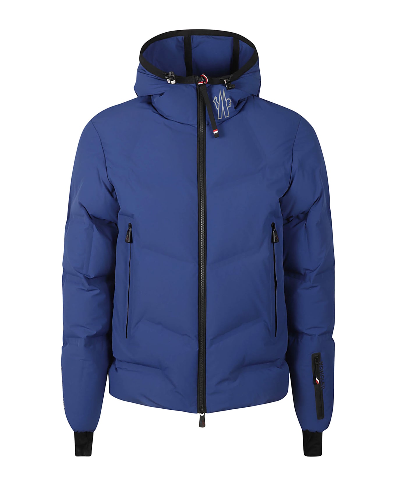 logo-print feather-down jacket from MONCLER GRENOBLE featuring cobalt blue, feather down, padded design, logo print embellishment, drawstring hood, front two-way zip fastening, long sleeves, ribbed cuffs, two side zip-fastening pockets and straight hem.