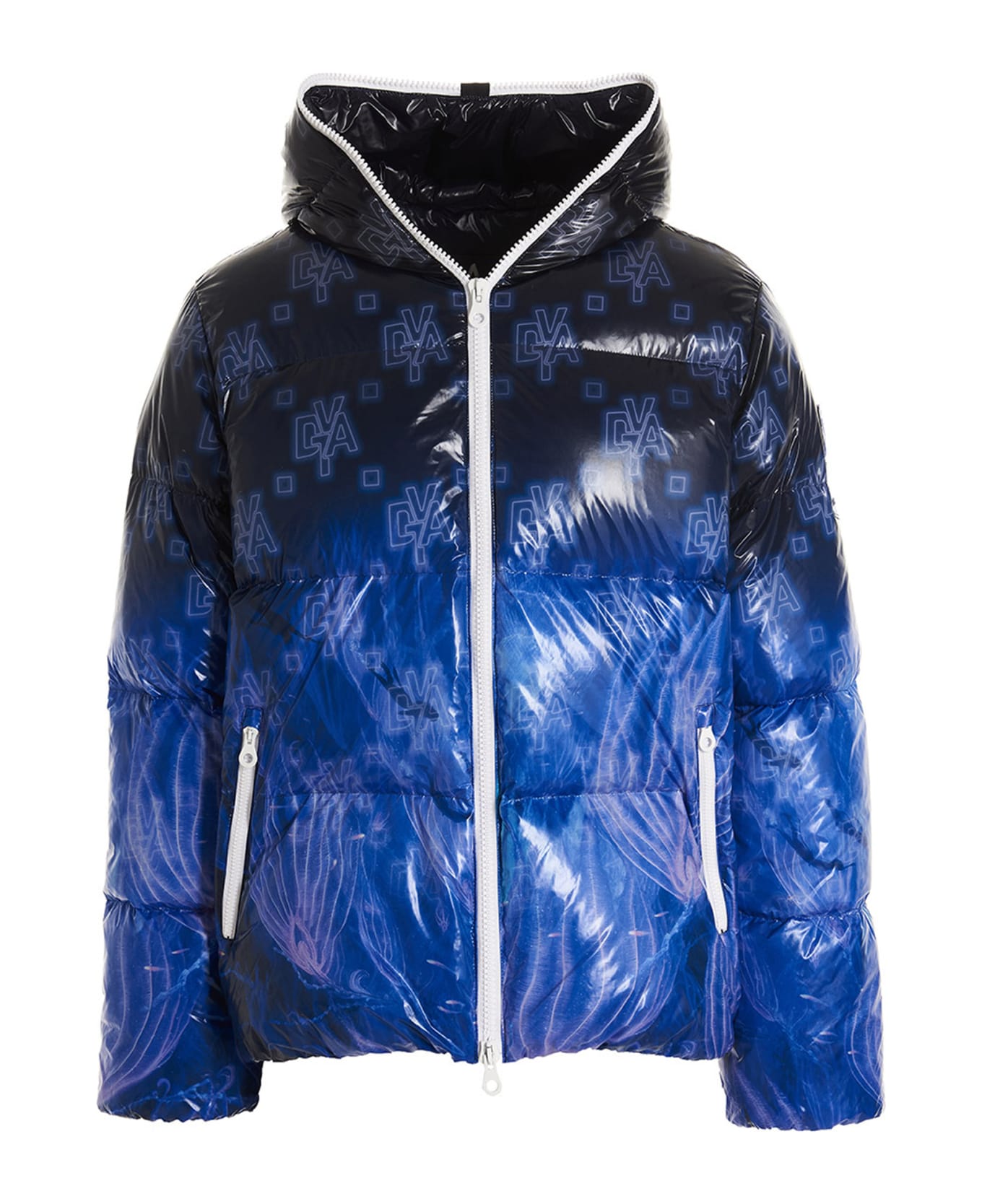 Auva' Avatar 2 capsule nylon down jacket with multicolor print, duck down padding and a hood, a zip closure, pockets, long sleeves, bottom drawstring and a logo patch on the sleeve.