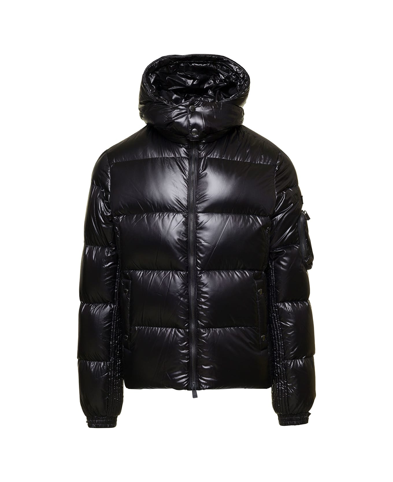 Down jacket Fixed hood Long sleeves with cuffs Front zip fastening Two front vertical pockets with snap buttons One patch pocket with zip on left sleeve Logo patch on left sleeve Shiny finish Black Nylon Regular fit