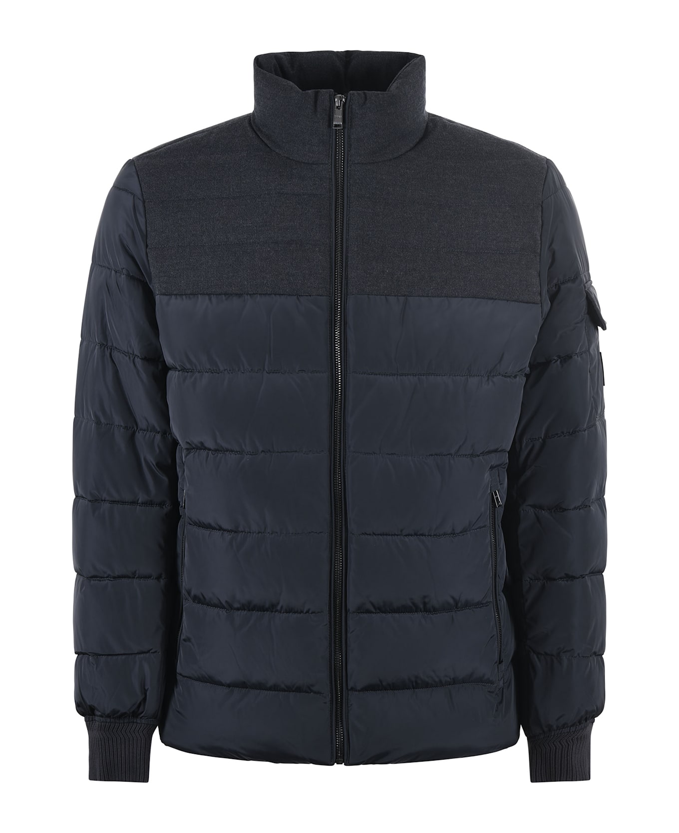 Boss jacket in dark gray quilted nylon. Flannel top. Padded. Polo neck. Zipped pockets. Internal pocket. Ribbed cuffs. Zip closure. Measurement in photo 48 100% polyester 88% cotton, 7% polyamide, 5% elastane Padding: 100% polyester