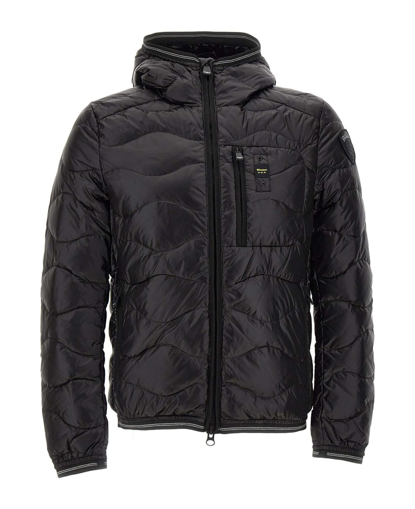 Blauer men's down jacket, black, in shiny nylon, wave quilting, hood, central fastening with double-slider zip hidden by matching herringbone tape, striped edge on cuffs and hem of sleeves,two pockets on front and another small patch pocket on left chest with vertical zip and iconic logo loop, internal pockets,shield patch on sleeve, feather padding 90/10, 85 gr. of weight, regular fit, ideal garment in high and low season.