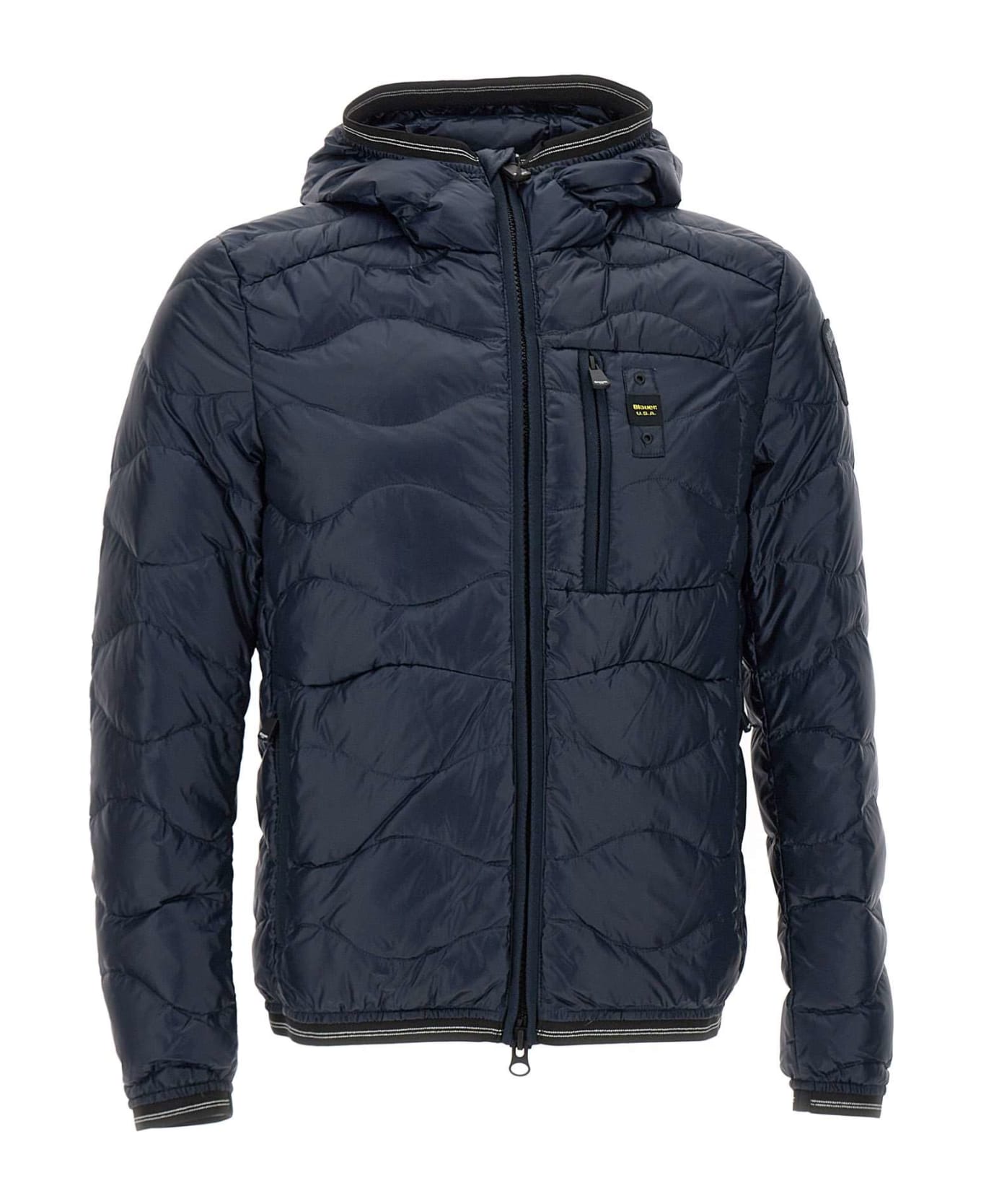 Blauer men's down jacket, blue, in shiny nylon, wave quilting, hood, central fastening with double-slider zip hidden by matching herringbone tape, striped edge on cuffs and hem of sleeves,two pockets on front and another small patch pocket on left chest with vertical zip and iconic logo loop, internal pockets,shield patch on sleeve, feather padding 90/10, 85 gr. of weight, regular fit, ideal garment in high and low season.