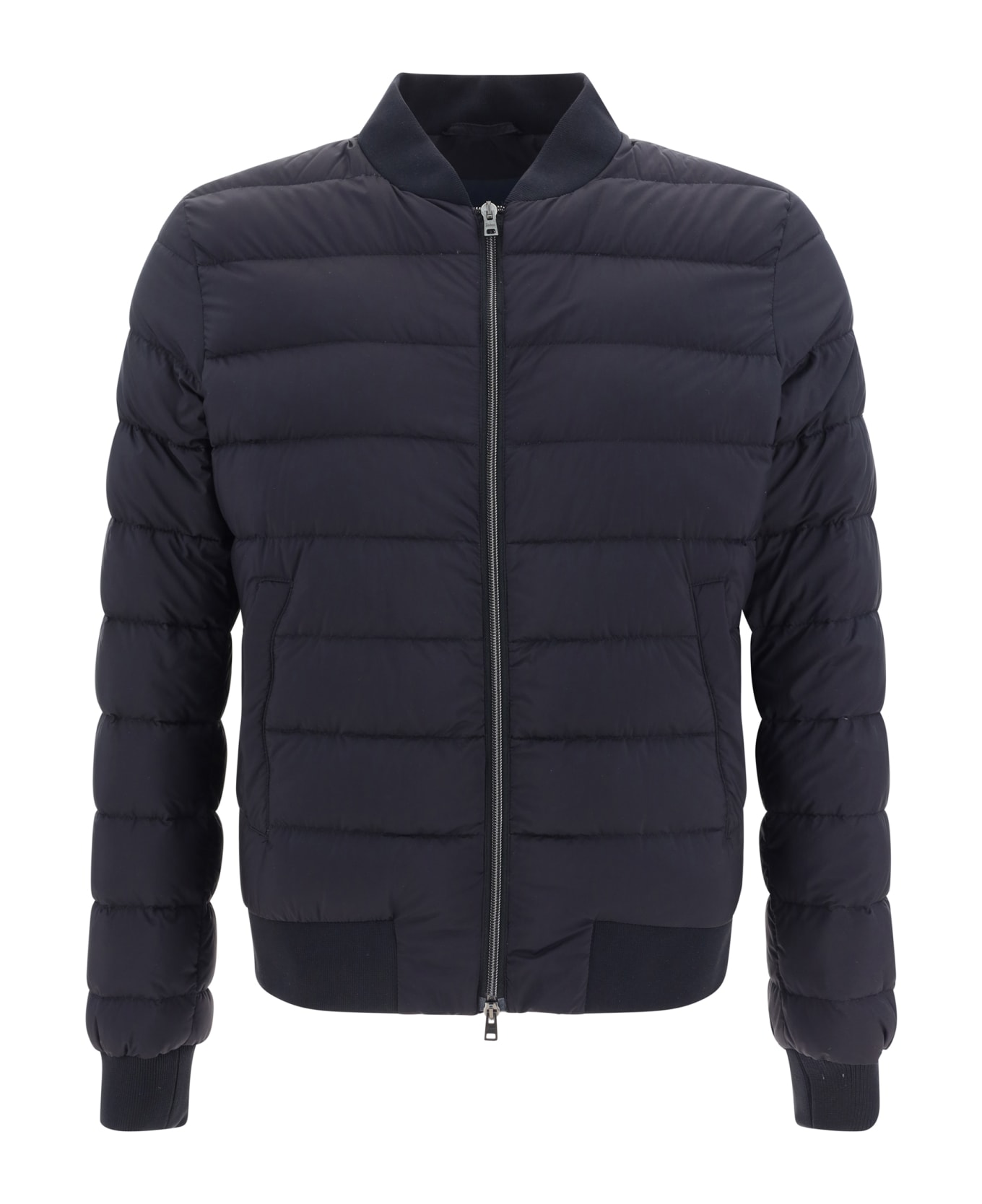 Down jacket by herno, double-slider front zipper closure, high neck pattern with elasticated ribbed trim, all-over quilted and padded design, two side welt pockets, contrasting embroidered engraved logo plaque on back, regular fit.