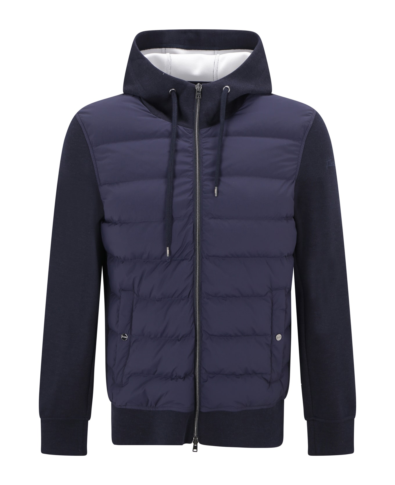 Down jacket by herno, padded and quilted front panel, design with drawstring adjustable hood, front zipper closure, two side welt pockets, ribbed cuffs and hem, stretch fabric design, iconic brand monogram embroidered on sleeve.