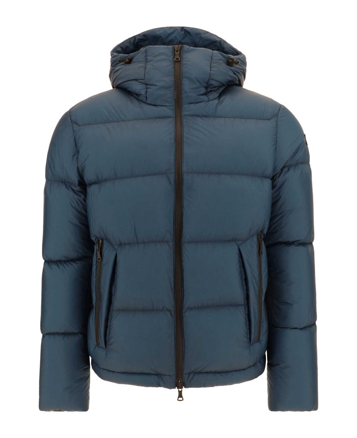 Down jacket by paul&shark, double-slider front zipper closure, hooded design with drawstring-adjustable high collar, double side welt pockets with zipper and button closure, all-over quilted and padded design, regular fit, patch with iconic brand monogram applied on left arm.