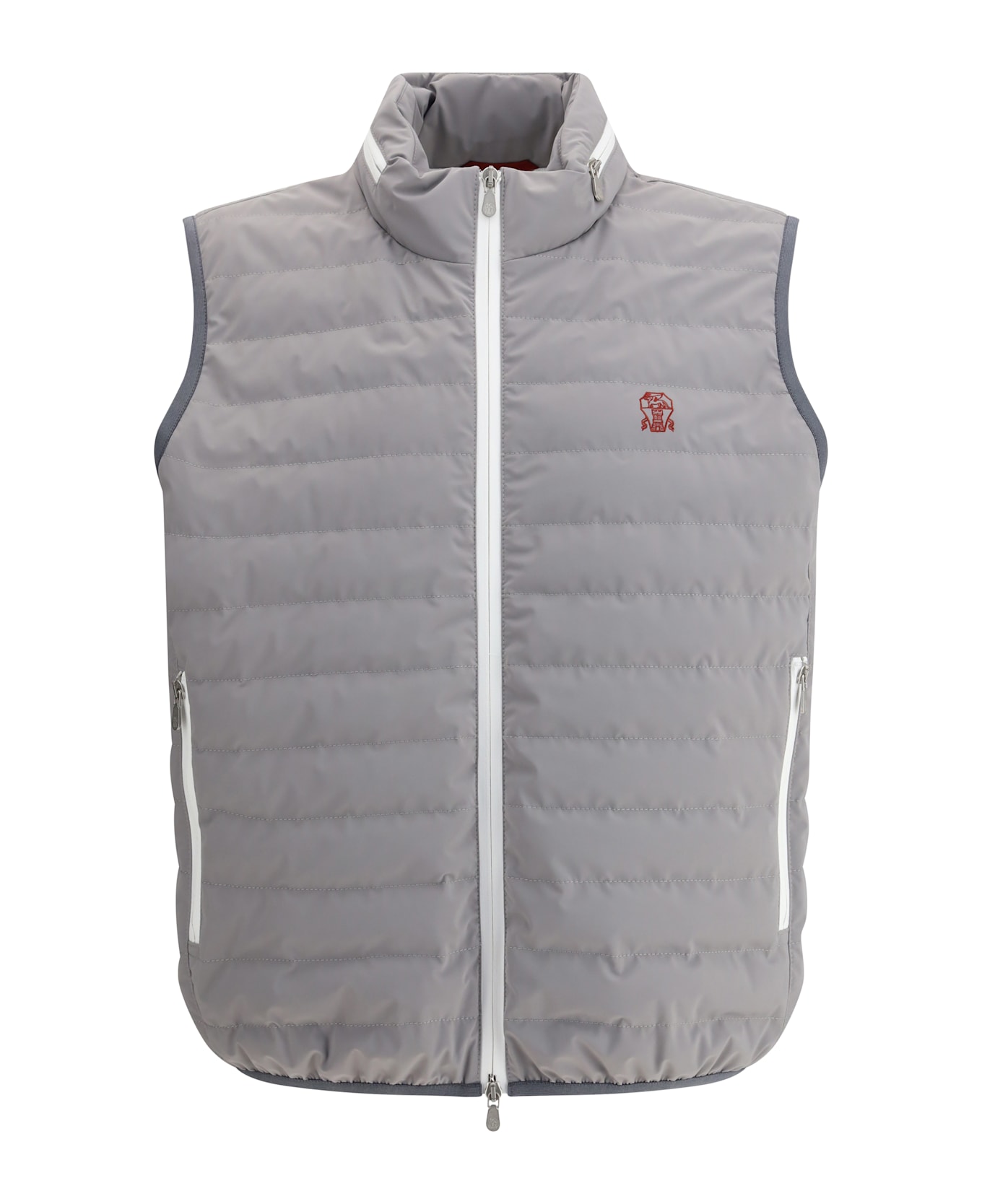 Brunello cucinelli's down vest is a versatile and stylish garment designed to provide comfort and warmth. the high neckline, equipped with a zippered hood storage pocket for closure, adds a practical and functional touch. the double-slider front zipper closure allows for easy adjustment, while the two zippered side welt pockets provide convenient storage space for small items. the all-over quilted design provides excellent protection from the cold, while the brand's iconic contrasting embroidered logo on the front underscores its authenticity. with a regular fit, this vest is perfect for those seeking a balance of style, practicality and luxury.