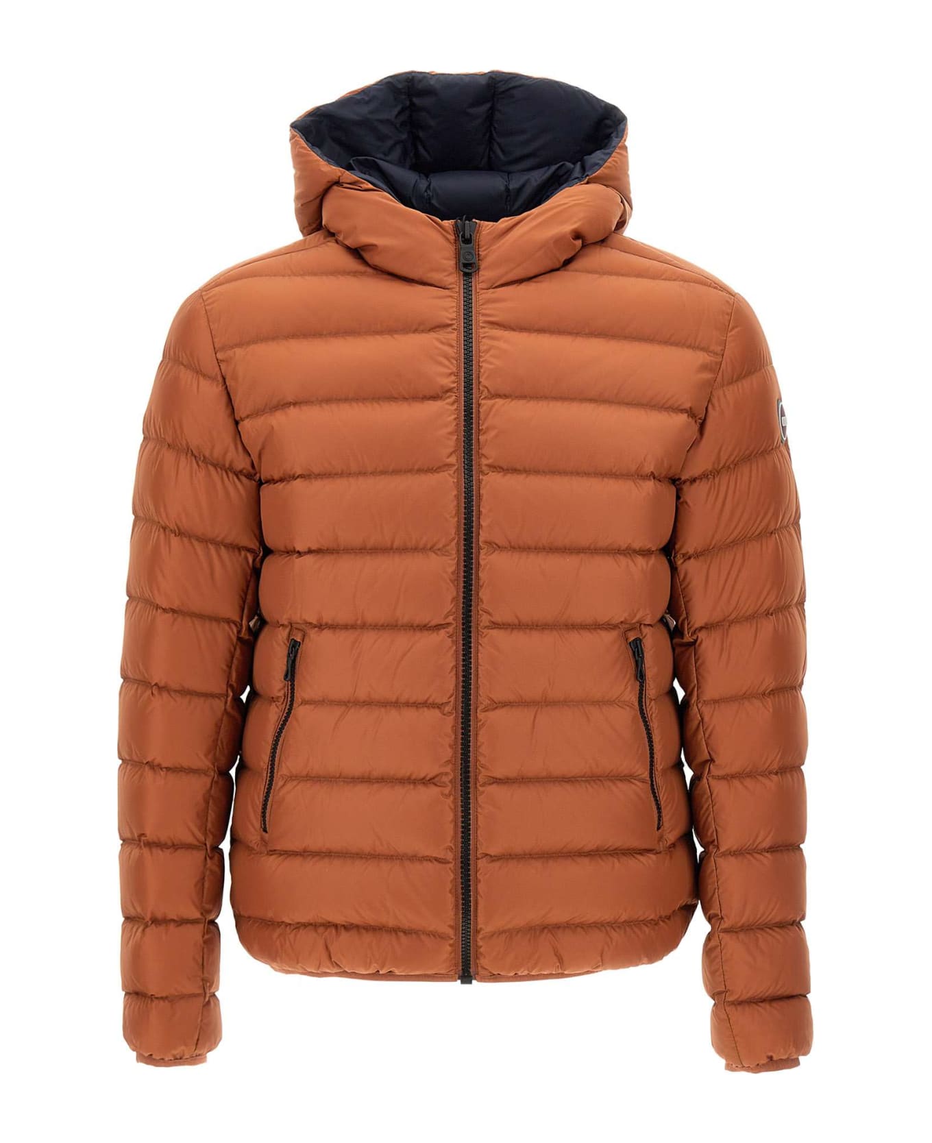 Colmar Originals 'E-Concrete' men's down jacket, brick color, hood, front zip fastening, two side pockets with zip, taped edges, inside pocket, water repellent, padded with duck down, iconic logo patch on left sleeve and at hem on back, ideal for autumn and winter season. Regular fit.