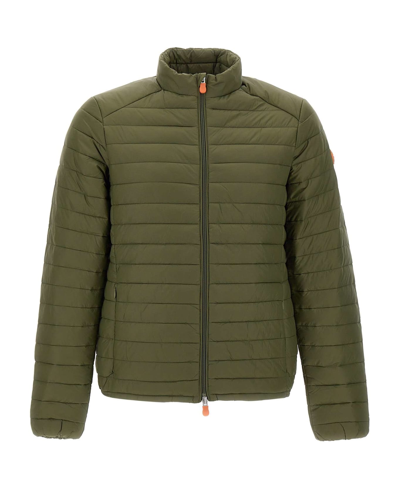 Men s Down Jacket Save The Duck "Giga16 Alex", military green, stand-up collar, front fastening with iconic orange zip puller, two side pockets with zip, iconic rubberized logo patch on left sleeve, bag included as case, exclusive eco-tech padding Plumtechfriendly lightweight ideal for spring and summer.