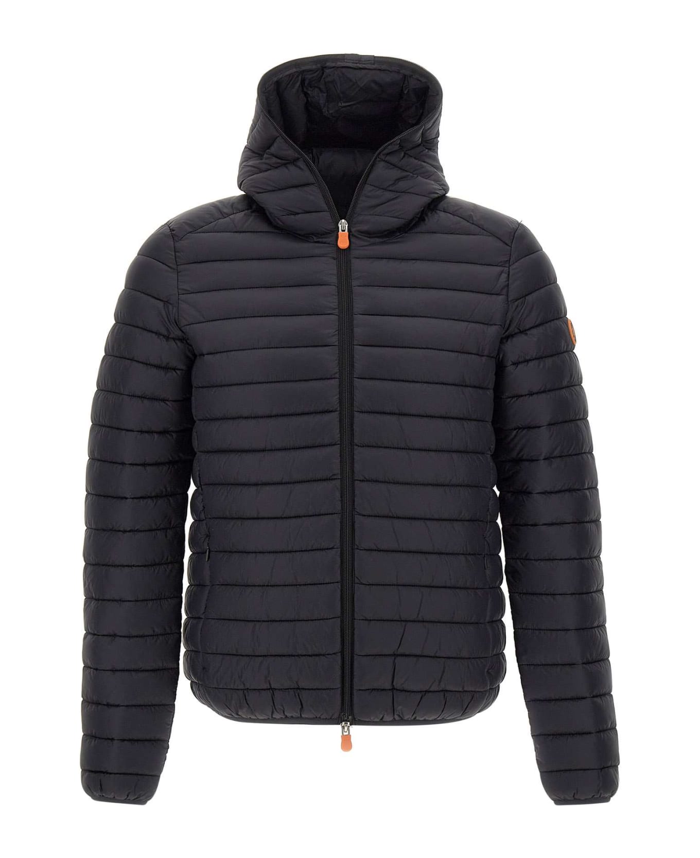 Men s Down Jacket Save The Duck "Giga16 Duffy", black, hood, front fastening with iconic orange puller, two side pockets with zip, iconic rubberized logo patch on left sleeve, bag included as case, exclusive padding Plumtech eco-friendly lightweight ideal for spring and summer.
