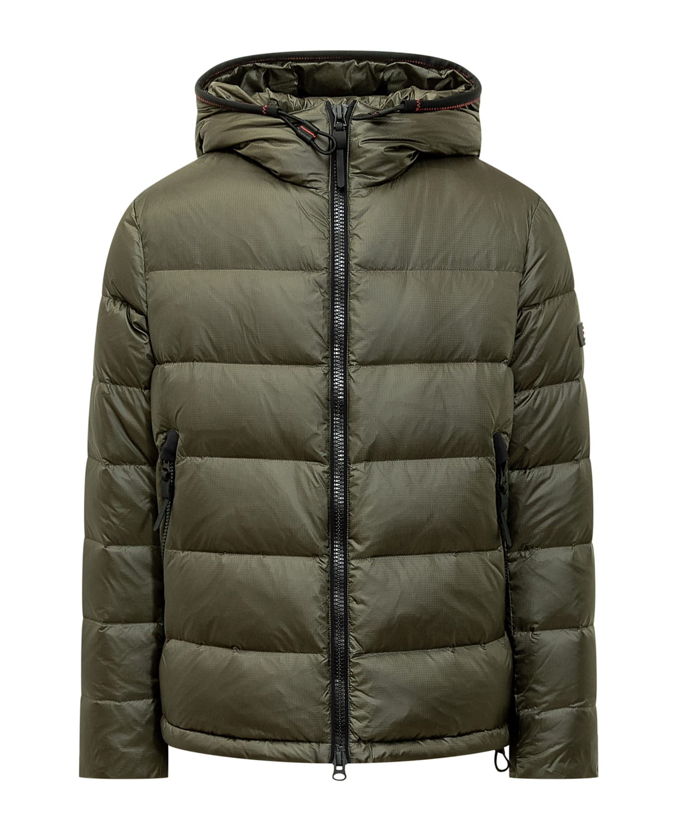Green down jacket with hood. Adjustable drawstring. Side pockets with zip. Closure with zip.