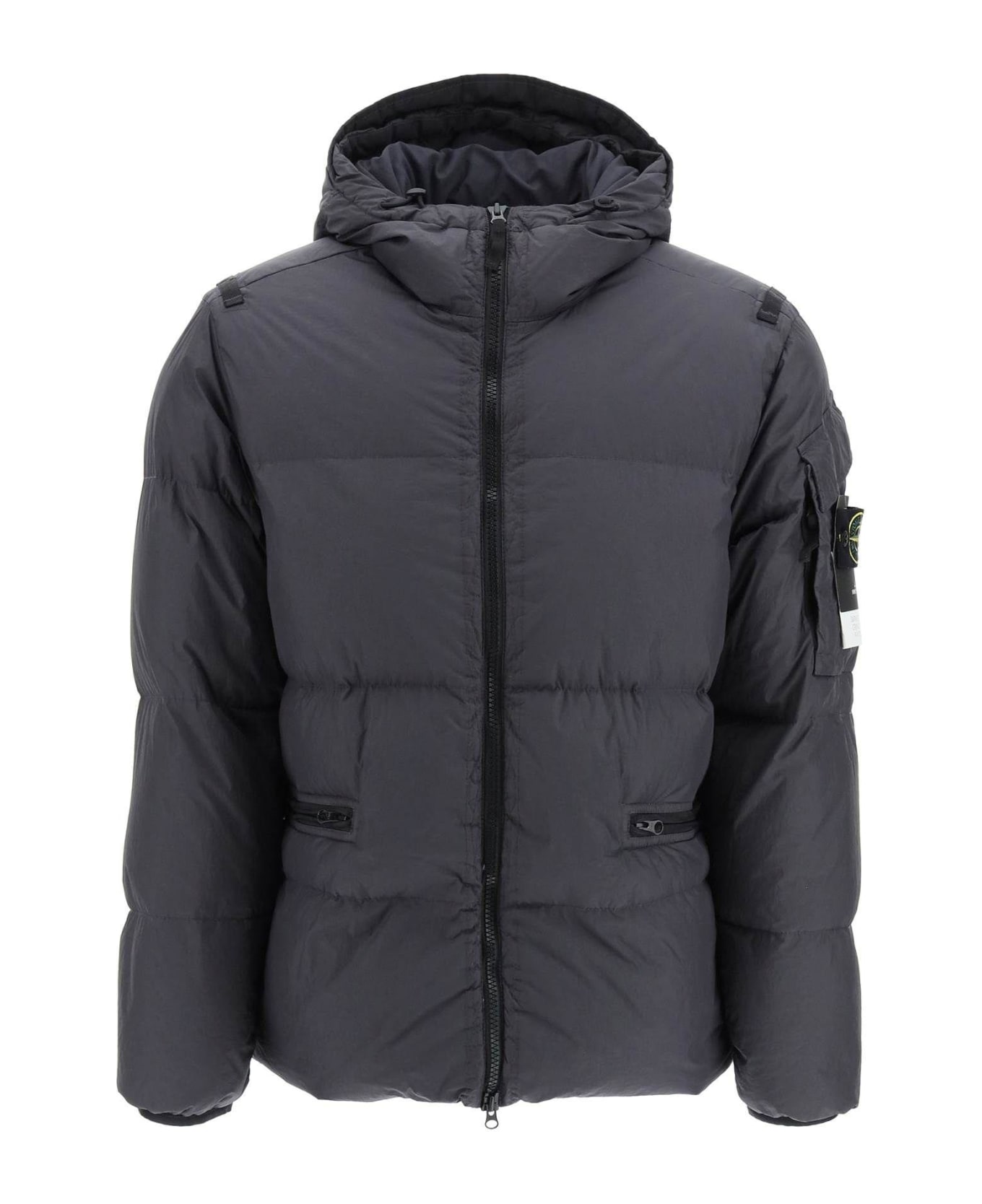 Stone Island down jacket with adjustable hood, made of recycled nylon Crinkle Reps with an inside resin coating that makes the fabric wind-resistant and mildly water-resistant. Padded with duck down via direct injection and finished with anti-drop agents, it features a front two-way zip closure and nylon tape loops at shoulders. Side welt pockets with zip and sleeve patch pocket featuring velcro flap, zipper and signature detachable logo badge. Full lining with internal drawstring and pocket. Regular fit. The model is 187 cm tall and wears a size L.