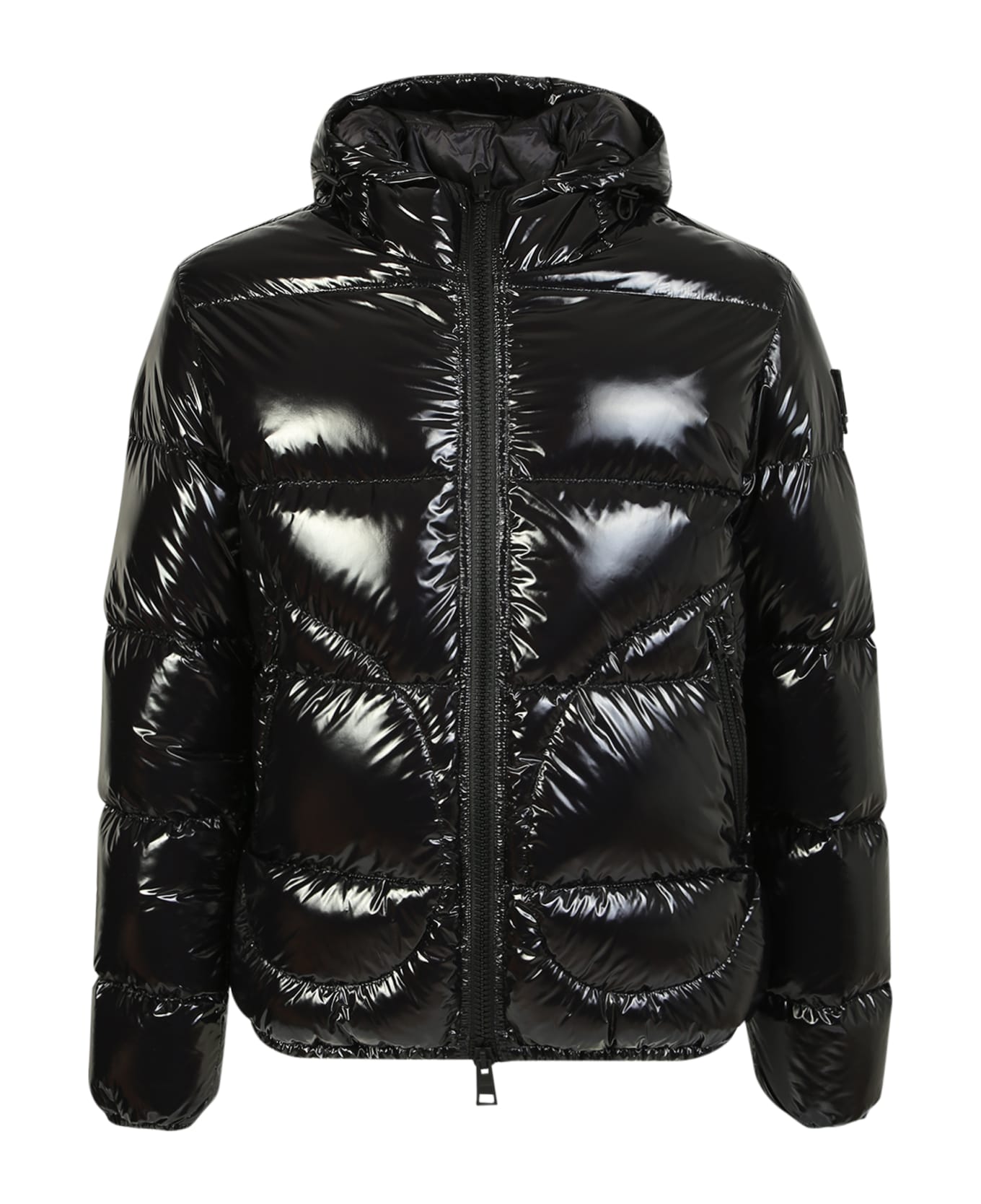 Classic hood. Long sleeves. Logo patch at the sleeve. Front zip fastening. Two side zip fastening pockets. Padded design. High shine finish. Straight hem. Color: black