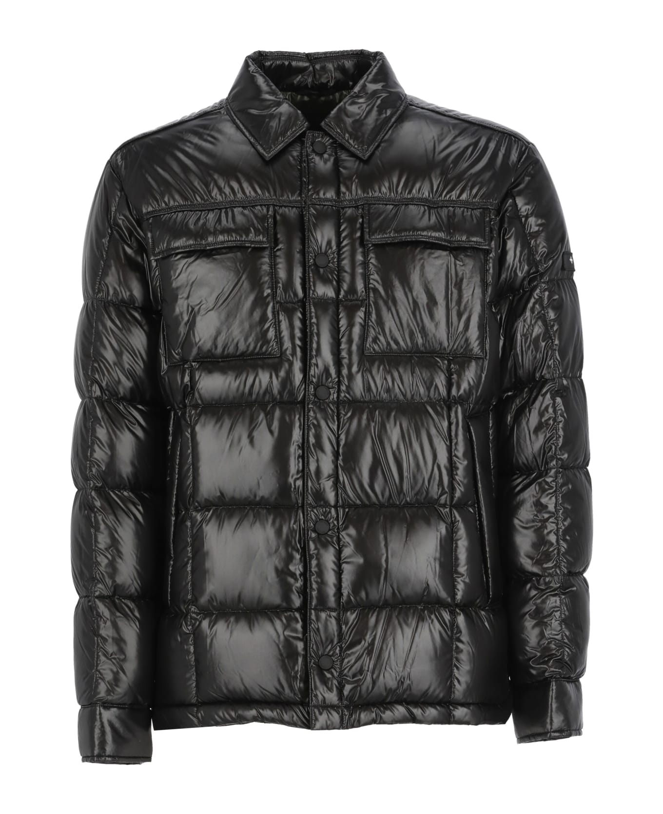 - Black Tatras padded and quilted down jacket for man - Collar - Fron snap buttons fastening - Long sleeves with button at cuffs - Tone on tone logoed patch at left sleeves - Two chest flap pockets with buttons - Two front buttons fastening pockets - Two side vents at hem