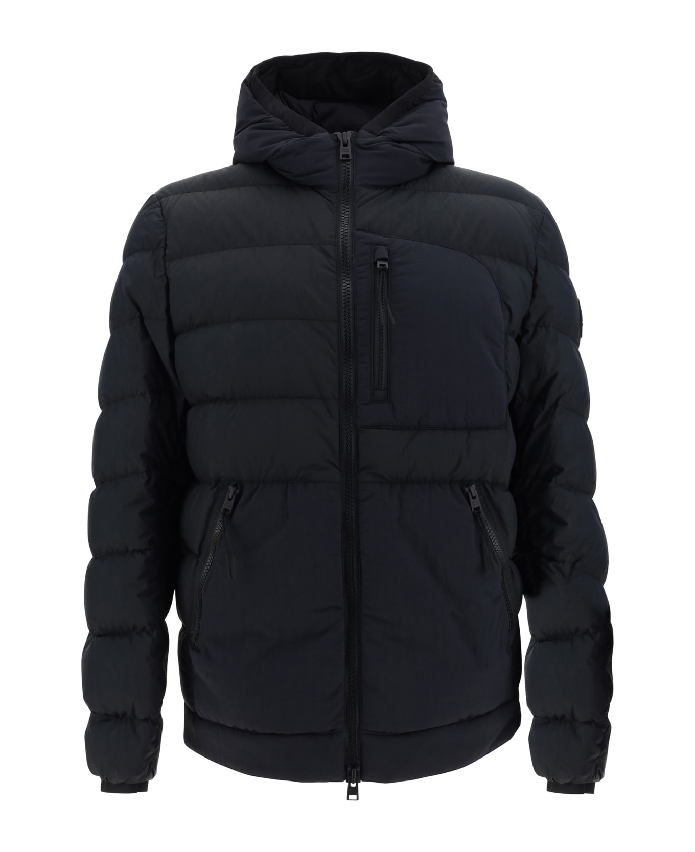 Lobster down jacket by woolrich, high-necked hooded design, front zipper closure, elasticized cuffs, two slit pockets with zipper appliqué on front, padded and quilted design, monochrome pattern, patch with iconic brand monogram appliqué on sleeve, regular fit.