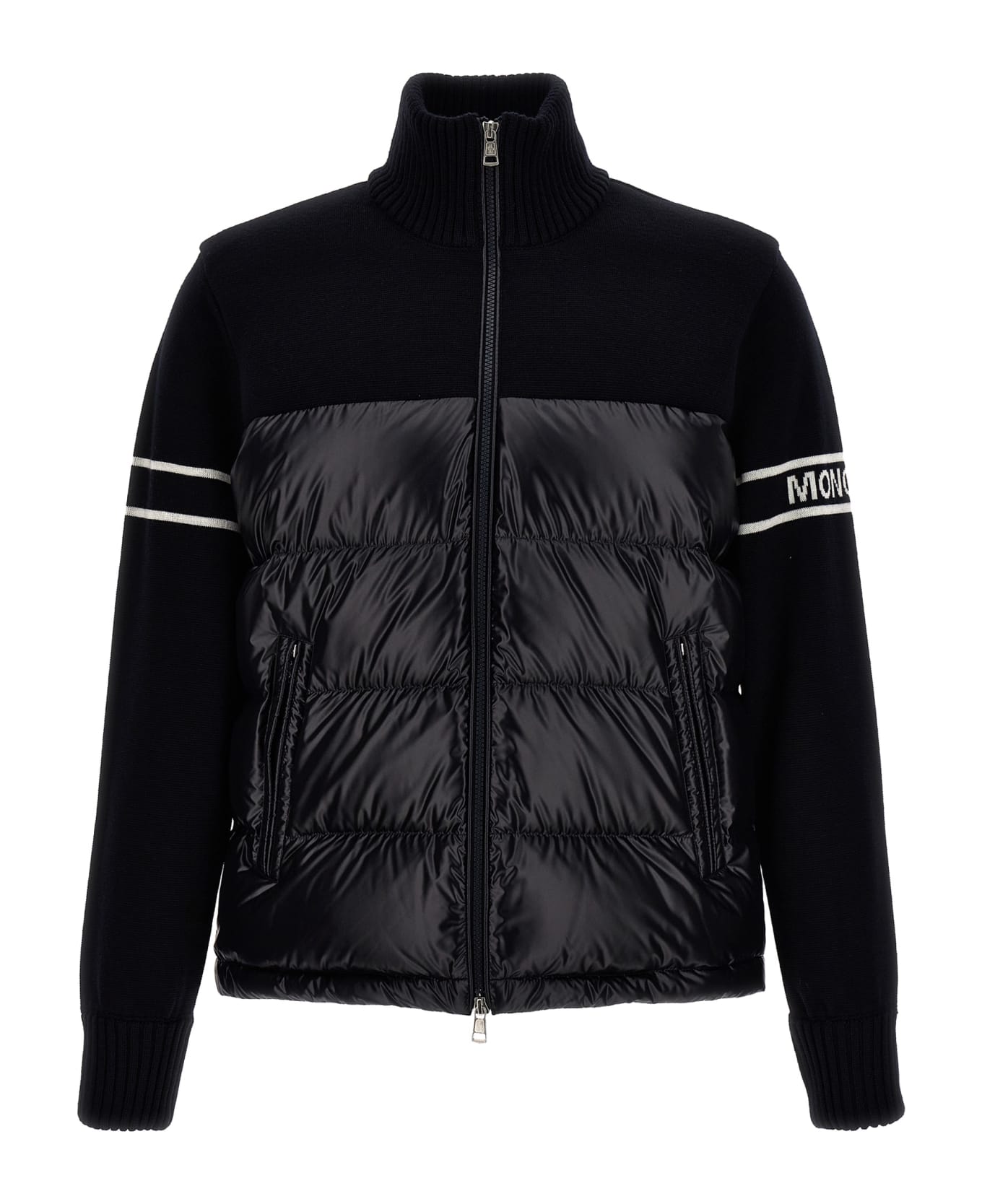 Padded nylon and wool blend cardigan with jacquard logo on the sleeve, high neck, zip closure, pockets, and long cuffed sleeves.