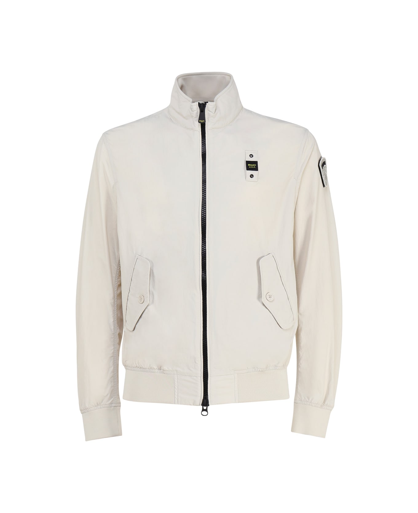 Light beige Maverick Stretch Nylon Bomber Jacket from Blauer -Lightweight nylon bomber jacket -Central closure with hidden double-slider zip -Two front pockets with flap and four-hole button and another inside pocket with velcro -Elastic nylon ribbed edge on the cuffs of the sleeves, inside the collar and on the bottom of the garment -Blauer loop in tone sewn on the chest -Velcro patch on the left sleeve -Colour: Light beige -100% Polyamide