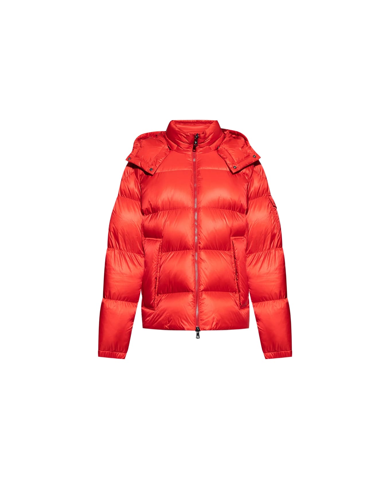 red quilted design hooded neckline zip fastening flap pockets logo patch