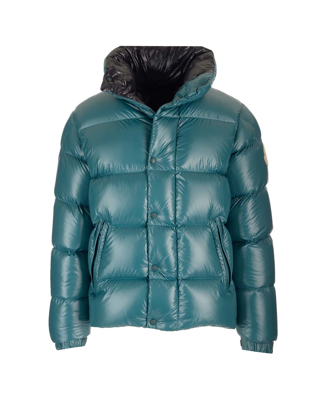 Petroleum 'Dervox' short down jacket from Moncler in light recycled nylon laqu lining in light recycled nylon laqu feather padding, stand collar, zip and automatic button fastening, zip pockets, adjustable inner shoulder straps, elasticated cuffs and bottom of the garment, patch applied on one sleeve with felt logo.