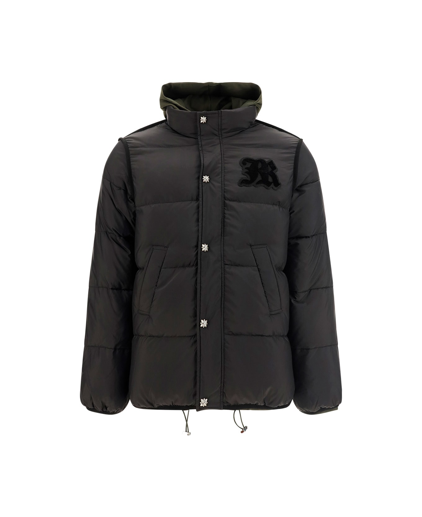 Piras down jacket by john richmond, contrasting double-layered, invisible zipper front closure with exposed buttons, hooded design, all-over padded and quilted design, drawstring waist, two zippered side welt pockets, elasticated ribbed cuffs, regular fit, iconic brand patch applied in contrast on front.