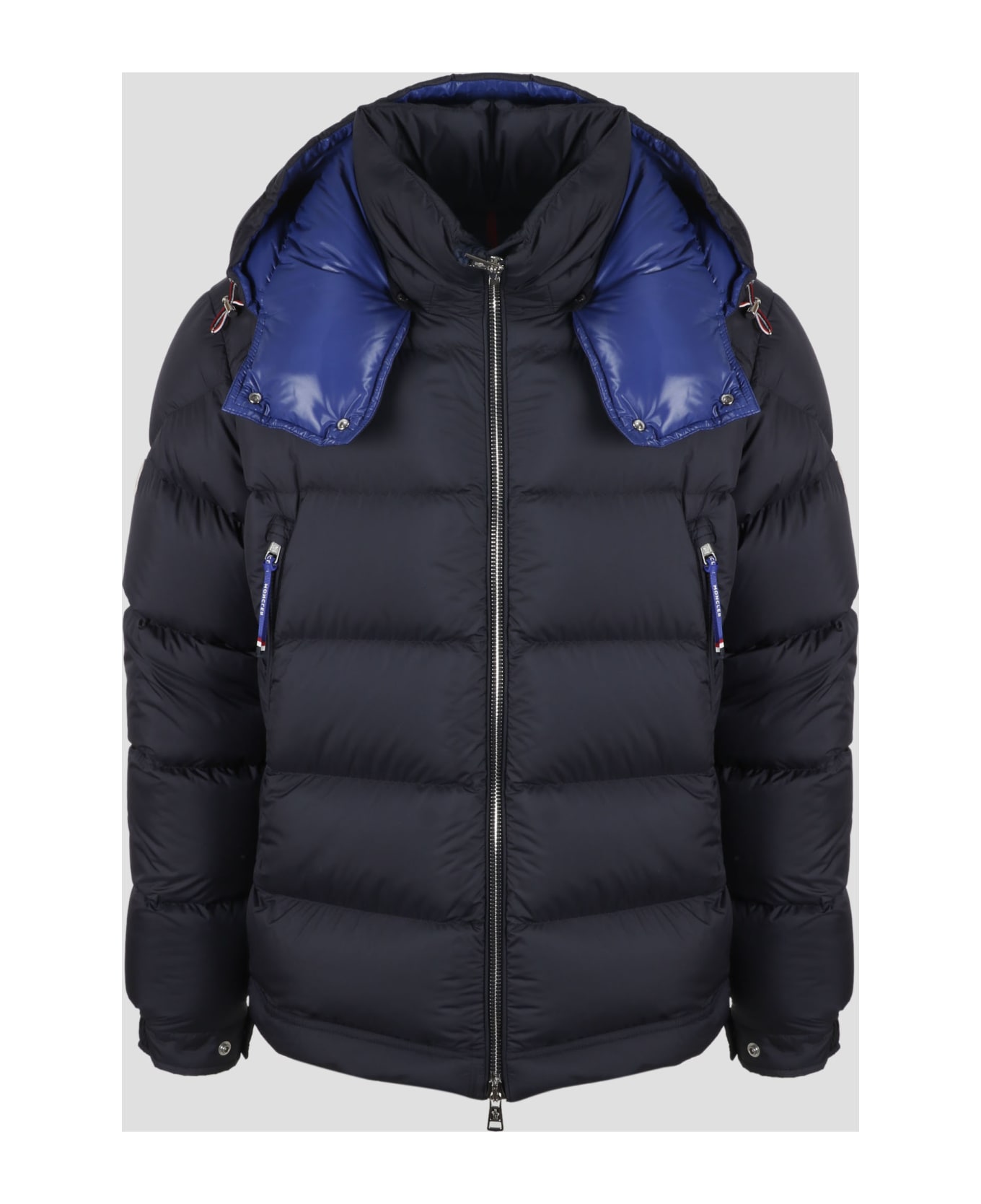 Moncler Poiried short down jacket, in nylon with contrasting lining. - Detachable drawstring hood with snap button closure - Zip fastening - Zipped pockets - Elastic cuffs - Hem with elastic drawstring fastening - Made in Romania - 100% Polyester