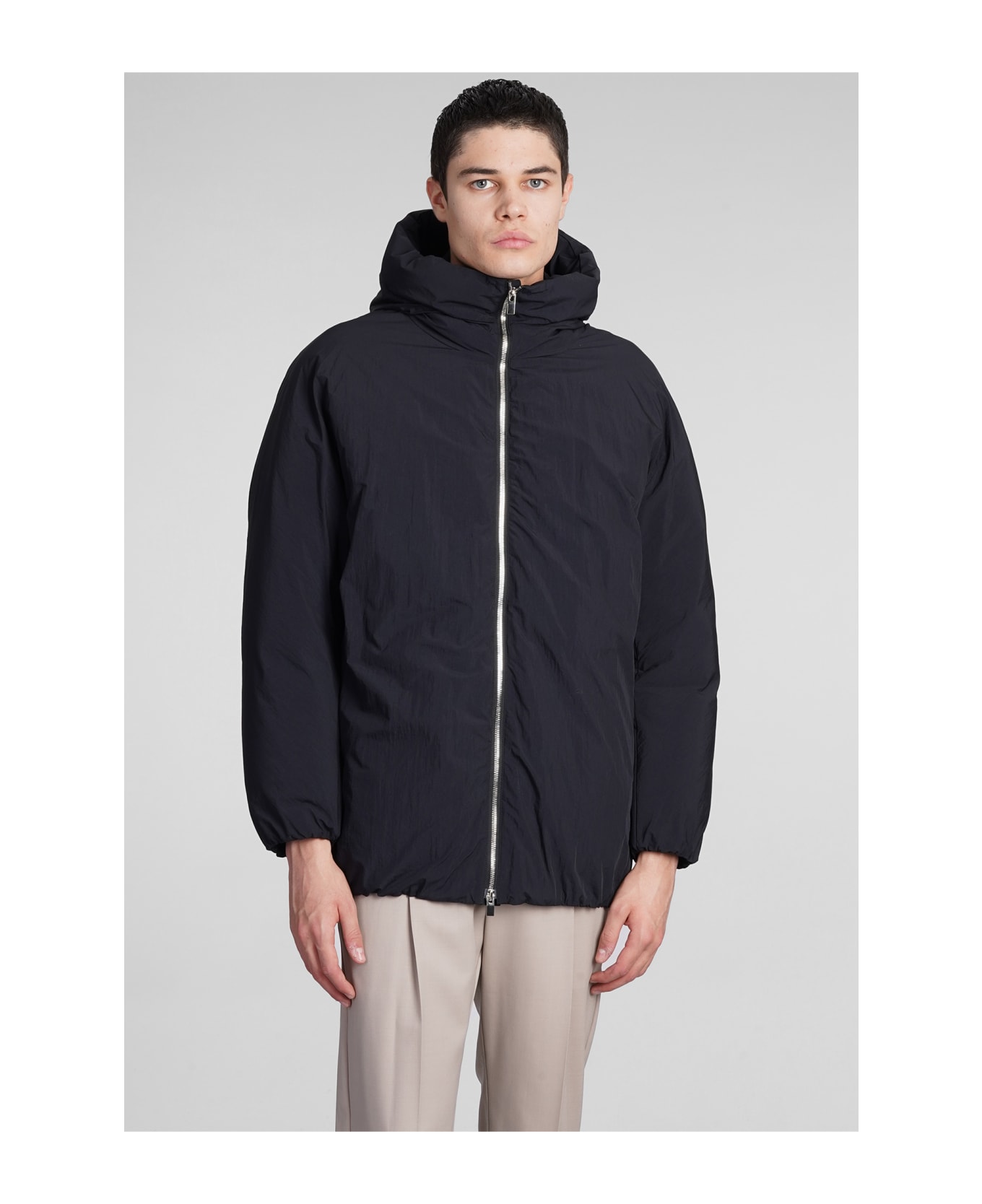 puffer in black nylon, hood, long sleeves, zip clousure, elastic cuffs, 100% Nylon, Model is 1. 83 cm and wears size 1, Made in China