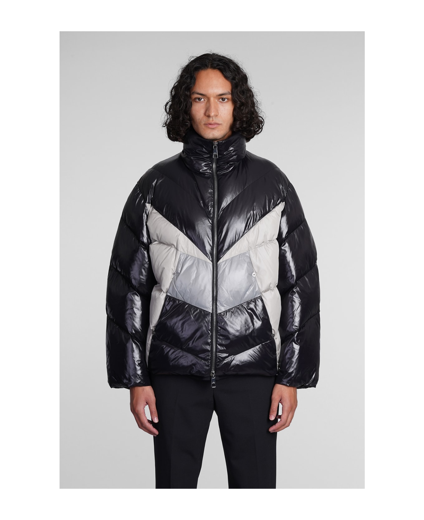 puffer in black nylon, high collar, zip clousure, long sleeves, pockets, quilted design, 100% Nylon, Model is 1. 83 and wears size M