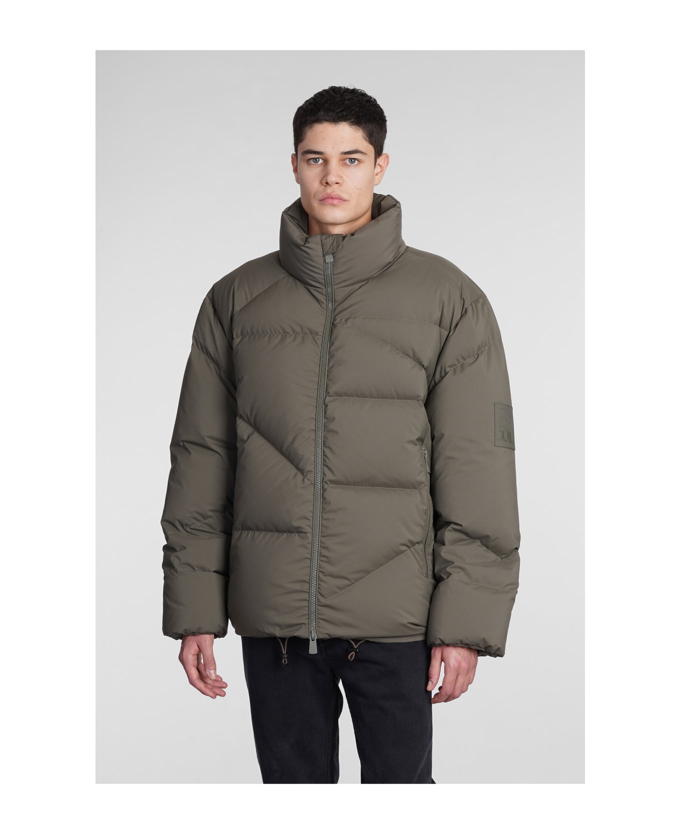 puffer in green polyester, high collar, zip clousure, padded design, long sleeves, pockets on side, patch logo , 100% polyester, Model is 1. 83 and wears size M