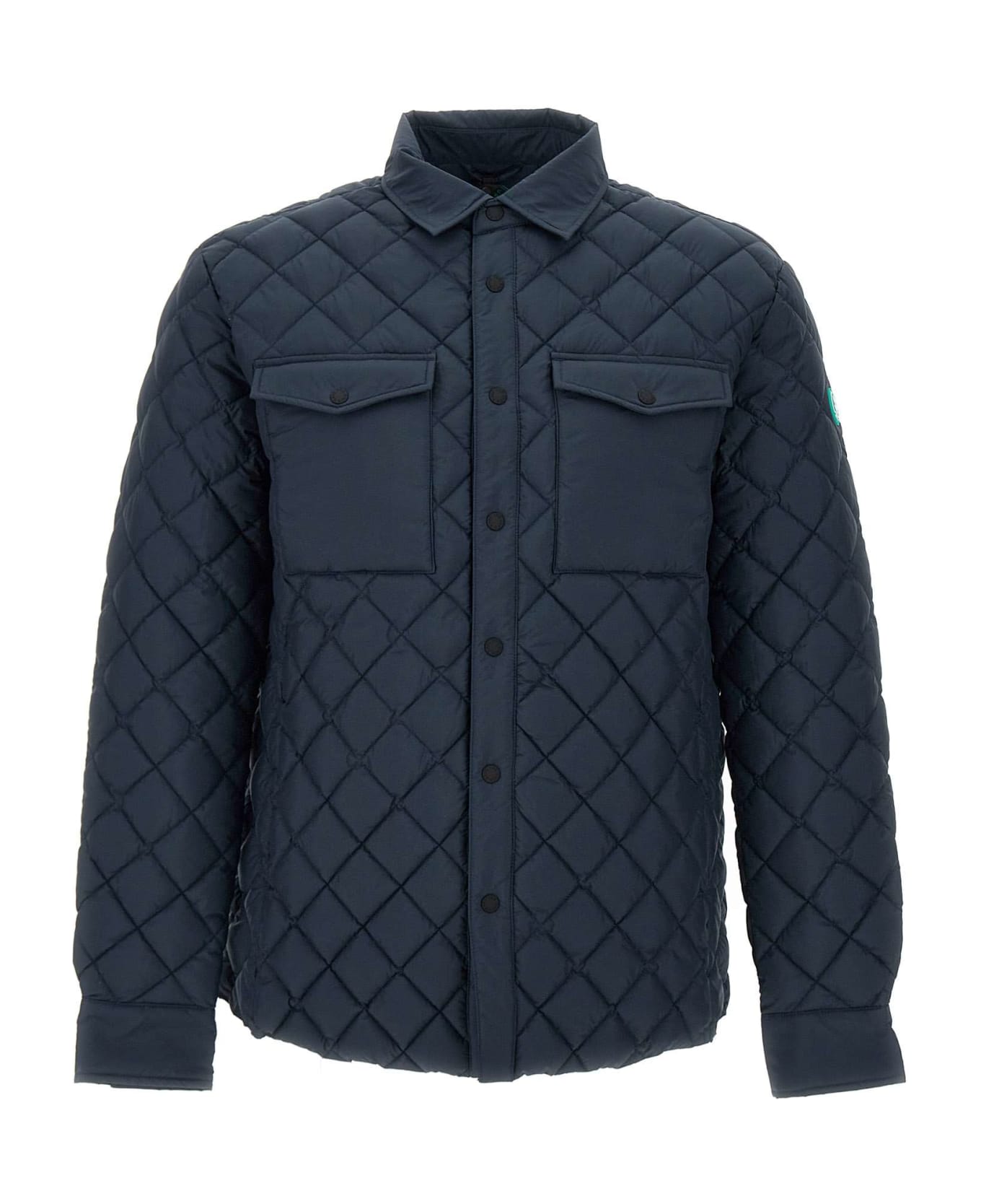 Save The Duck "Recy16Ozzie" men's jacket, navy blue, recycled line of brand, shirt design, made with lightweight, wind and water resistant recycled fibers, diamond quilting, point collar, two chest flap pockets with contrasting black buttons, two side zip pockets, front fastening with black buttons, iconic logo patch on left sleeve,regular fit, perfect for high and low season. Storage bag included.