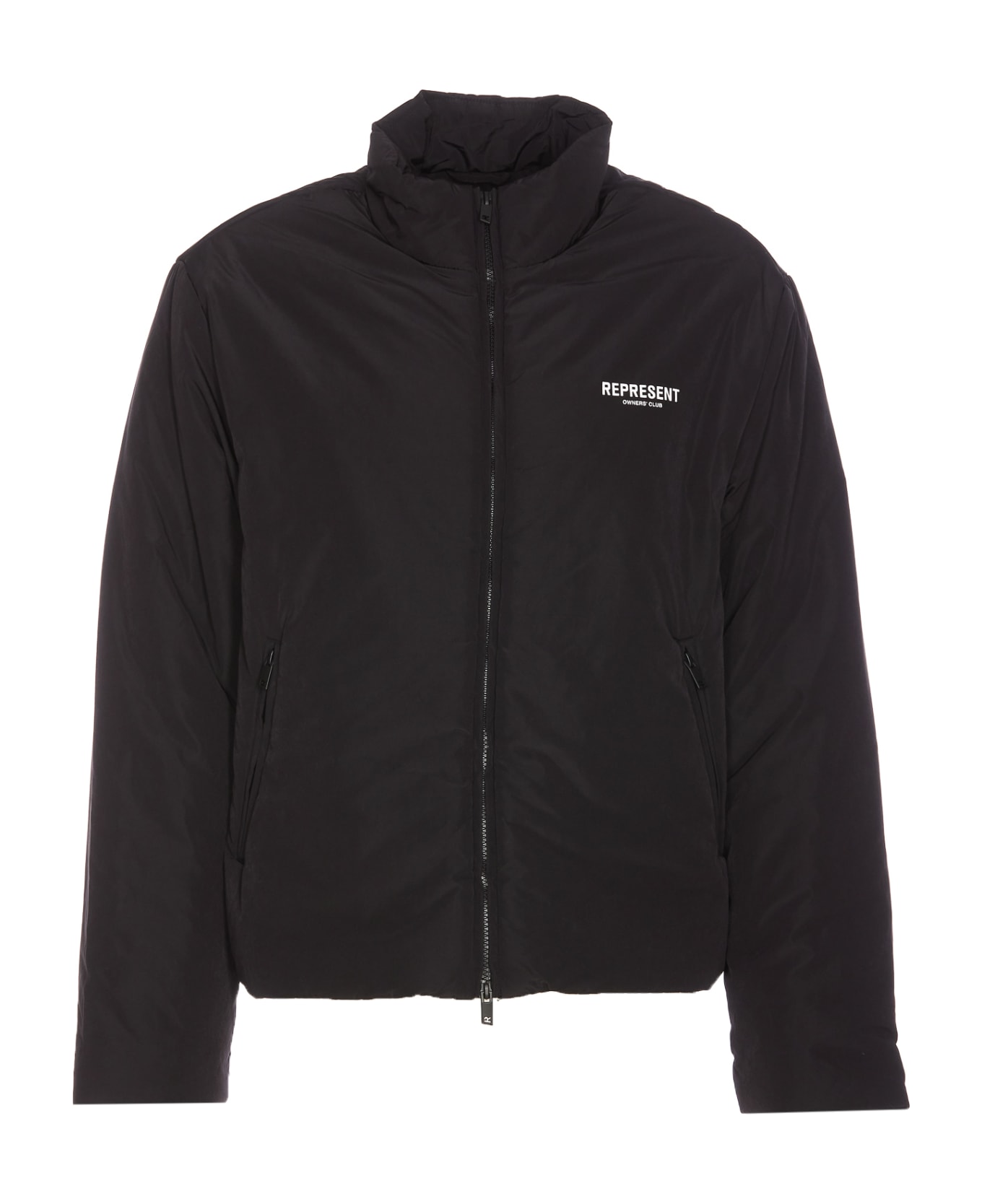 Represent black down jacket with frontal zip closure, eco padded, frontal print logo, lateral zip pockets, padded, maxi print logo on the back Composition: 82% Polyester, 18% Nylon