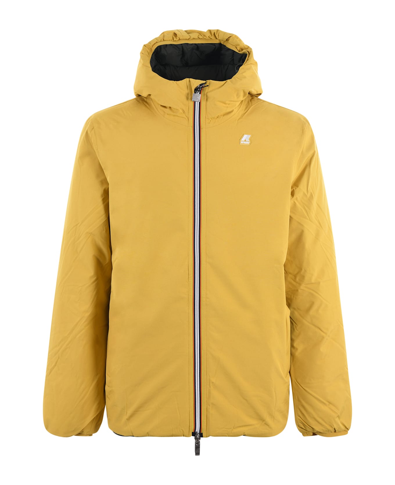 Reversible K-Way down jacket in yellow/military green nylon. Quilted green side, smooth yellow side. Padded with goose down. Waterproof. Water repellent. Windproof. Hood with drawstring. Double slider zip closure. 2 zipped pockets. 2 pockets with press studs. Drawstring at the bottom. Elasticated wrists. Front logo. Measurement in photo L 100% polyamide Padding: 90% down, 10% feather