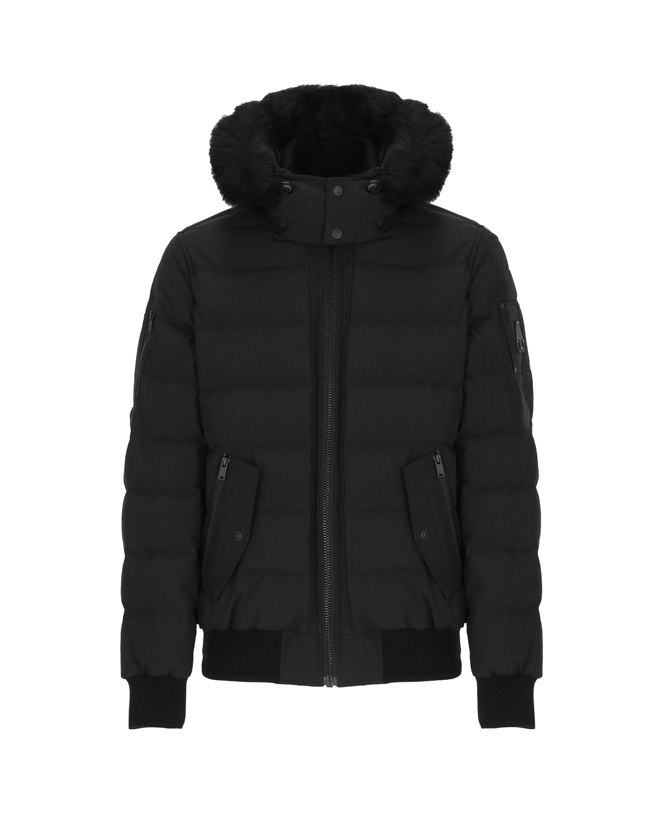 - Black Moose Knuckles quilted down jacket for man - High neck with buttons - Long sleeves - Removable hood with fur and buttons - Two front zip pockets - Two front flap pockets - One patch with metallic logo at left sleeve - Four front zip pockets
