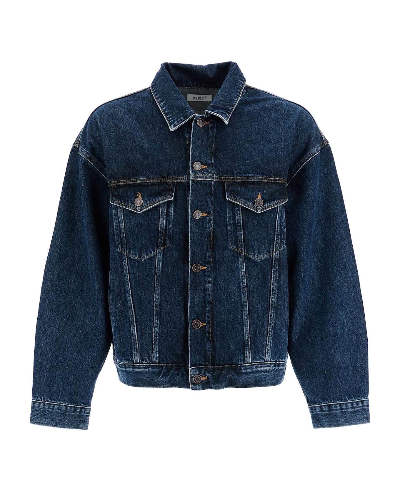The Stefano denim jacket by Agolde is made of classic cotton denim with two flap pockets and two welt pockets on the chest. It features a front button closure and a regular fit. The model is 182 cm tall and wears size L.