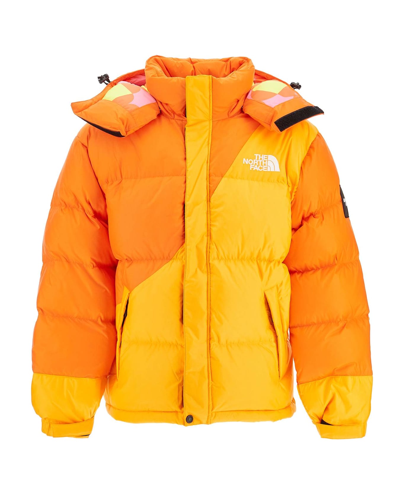 The North Face Puffer Jacket, in collaboration with Yinka Ilori, is made of quilted and padded nylon and features the artist's graphic print on the inside and removable hood. It has a hidden full zip closure with velcro and snap buttons, adjustable drawstring hem, side pockets with drawstrings, and an additional pocket on the inside. The fit is oversized. The model is 182 cm tall and wears size L.