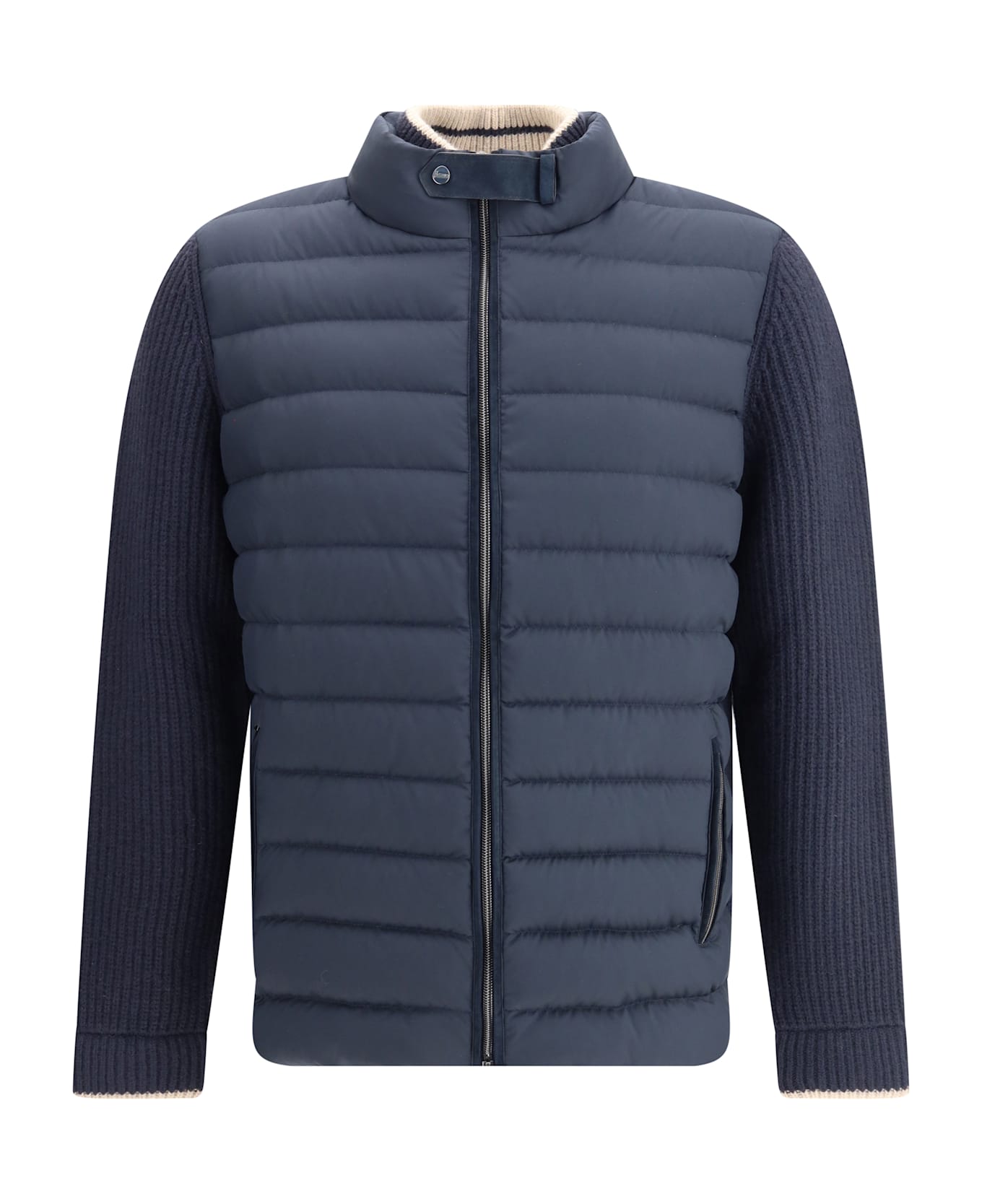 The jacket by herno expresses technical excellence and distinctive style through a design that merges knitwear comfort with the warmth of down quilting. the english rib texture blends harmoniously with the striped padding, creating a balance of material richness and lightness. the double-layer wool construction with dual zip and ribbed cuffs adds both function and refinement, while the high collar and flap pockets enhance its sophisticated appeal. the metal logo on the back completes a piece designed to accompany the season with effortless elegance.