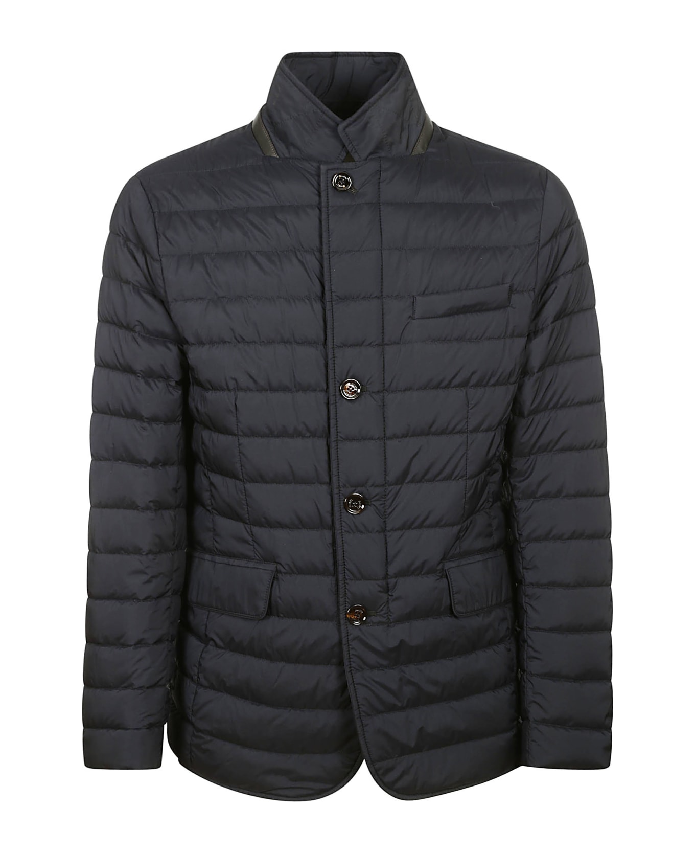 Moorer Field Jacket in blue technical fabric, flap pockets and breast pocket, button closure, quilted workmanship.