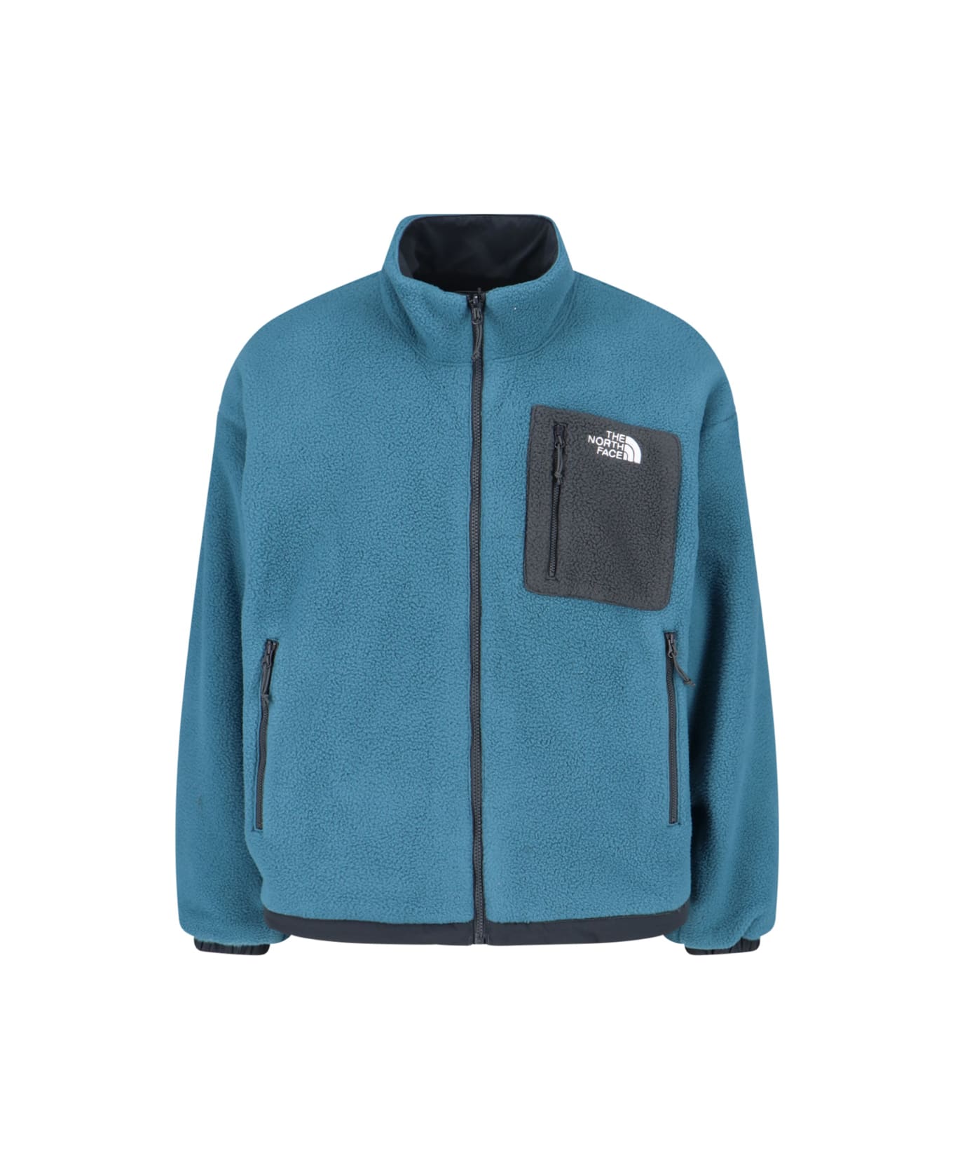 The North Face 'Yumiori Rev' fleece jacket in light blue fabric with zip closure, dropped shoulders, contrast zip pocket on the front, contrast logo print detail on the front, two front zip pockets, contrast trim, straight hem.