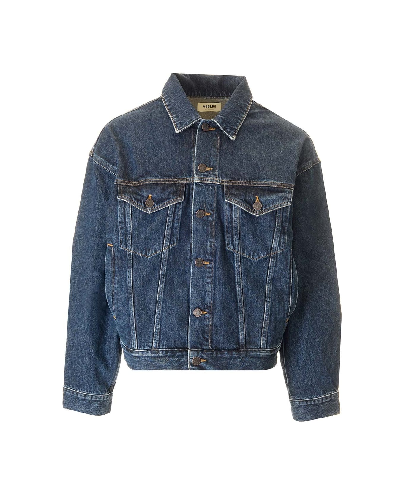 Dark blue "Stefano" denim jacket by Agolde with a loose fit, shirt collar and two buttoned patch pockets on the front.