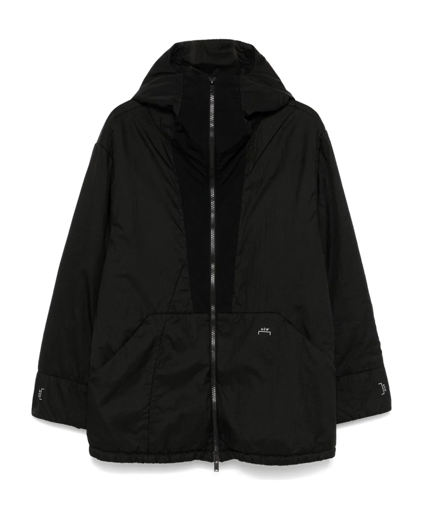 Black Contour jacket, crinkled finish, padded design, front two-way zip fastening, high neck, classic hood, long sleeves with elasticated cuffs, logo print to the front and cuff, two press-stud fastening side pockets, full lining, drawstring hem