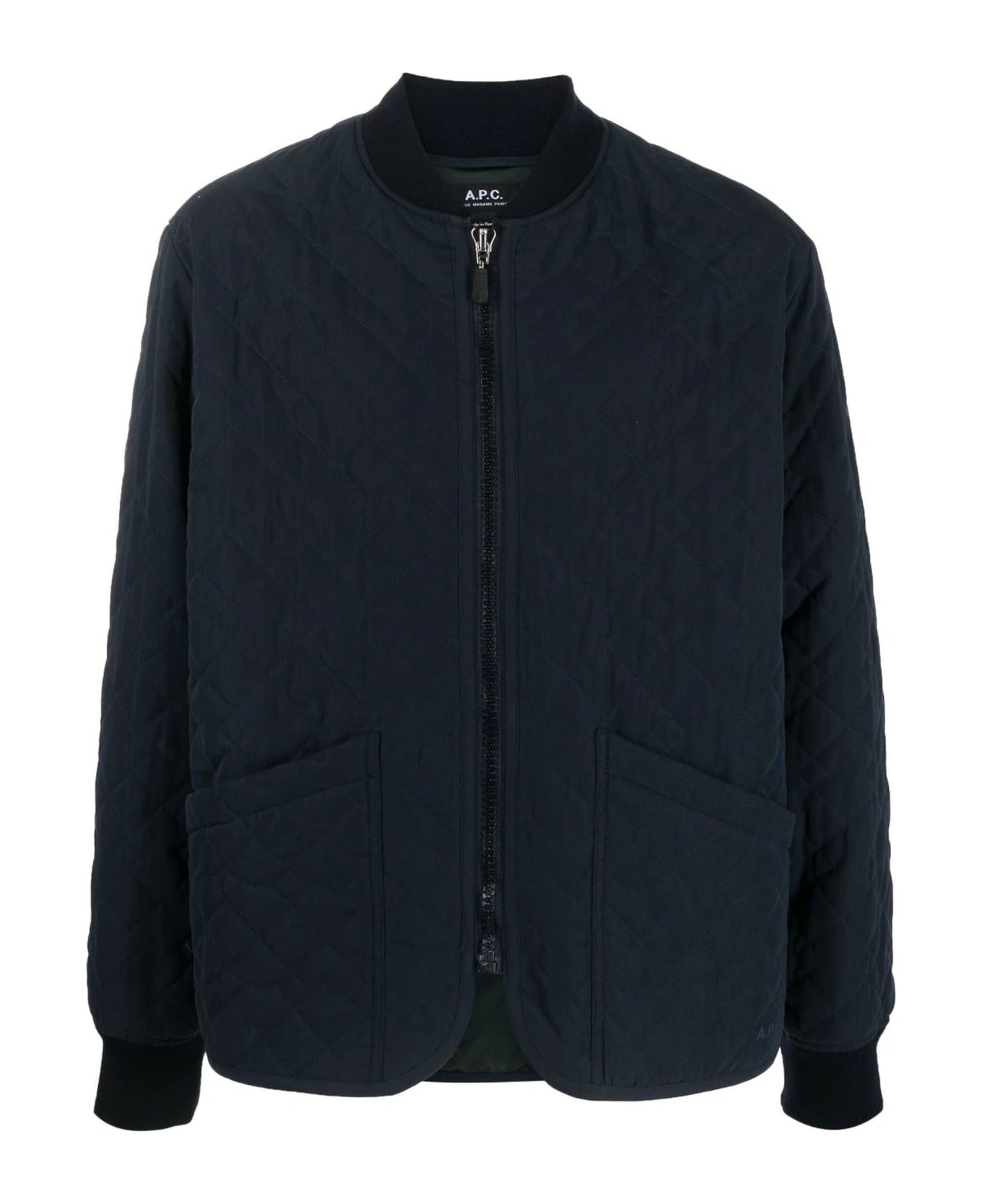 Navy blue cotton blend quilted bomber jacket, band collar, ribbed trim, front zip fastening, long sleeves, two side slit pockets, logo print at the hem, straight hem Composition: Cotton, 75% Polyamide, 25%