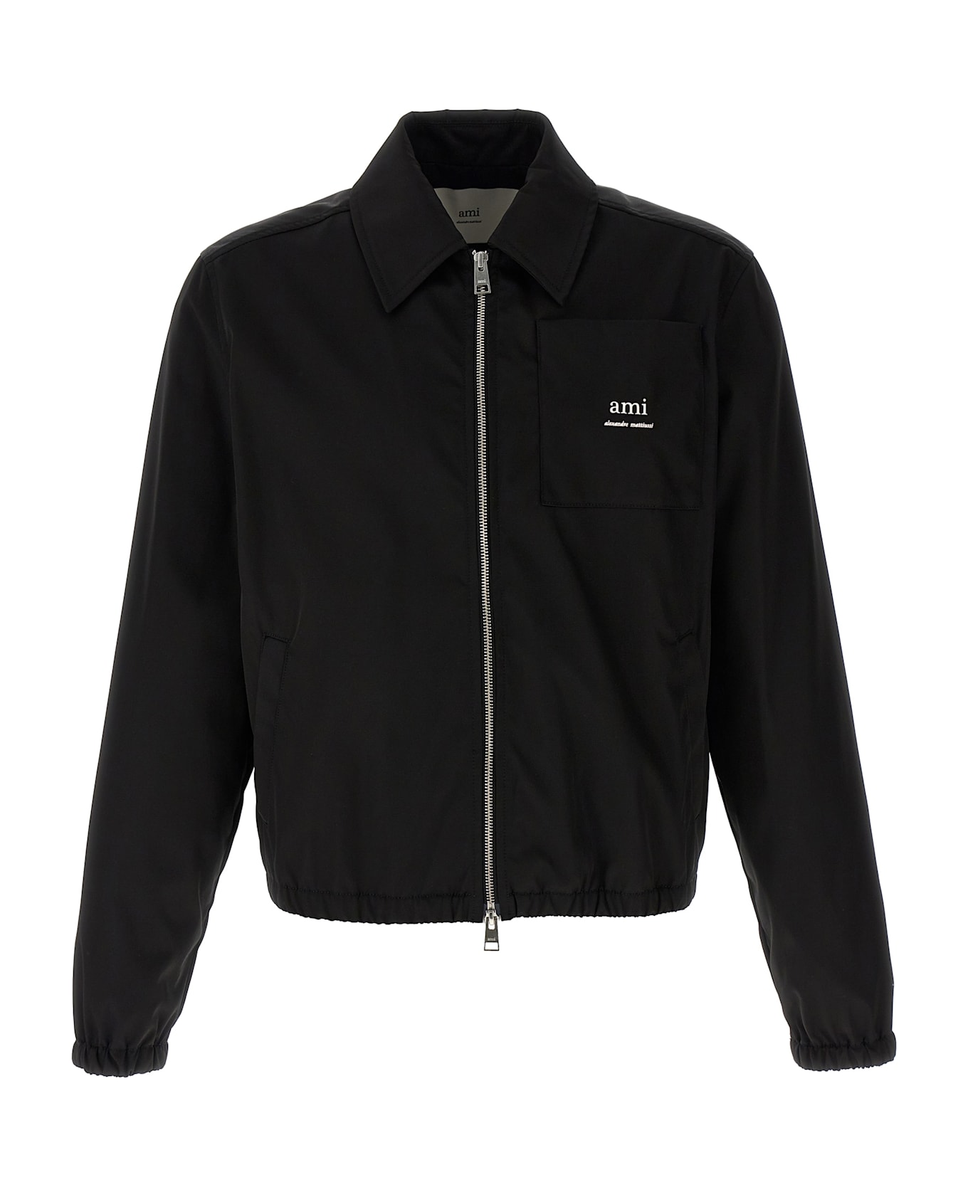 'AMI zipped' jacket in satin and cotton effect fabric, pocket with metal lettering logo, shirt collar, front zip closure, pockets, long sleeves with elastic cuffs, elastic hem Composition: 70% polyamide 30% cotton