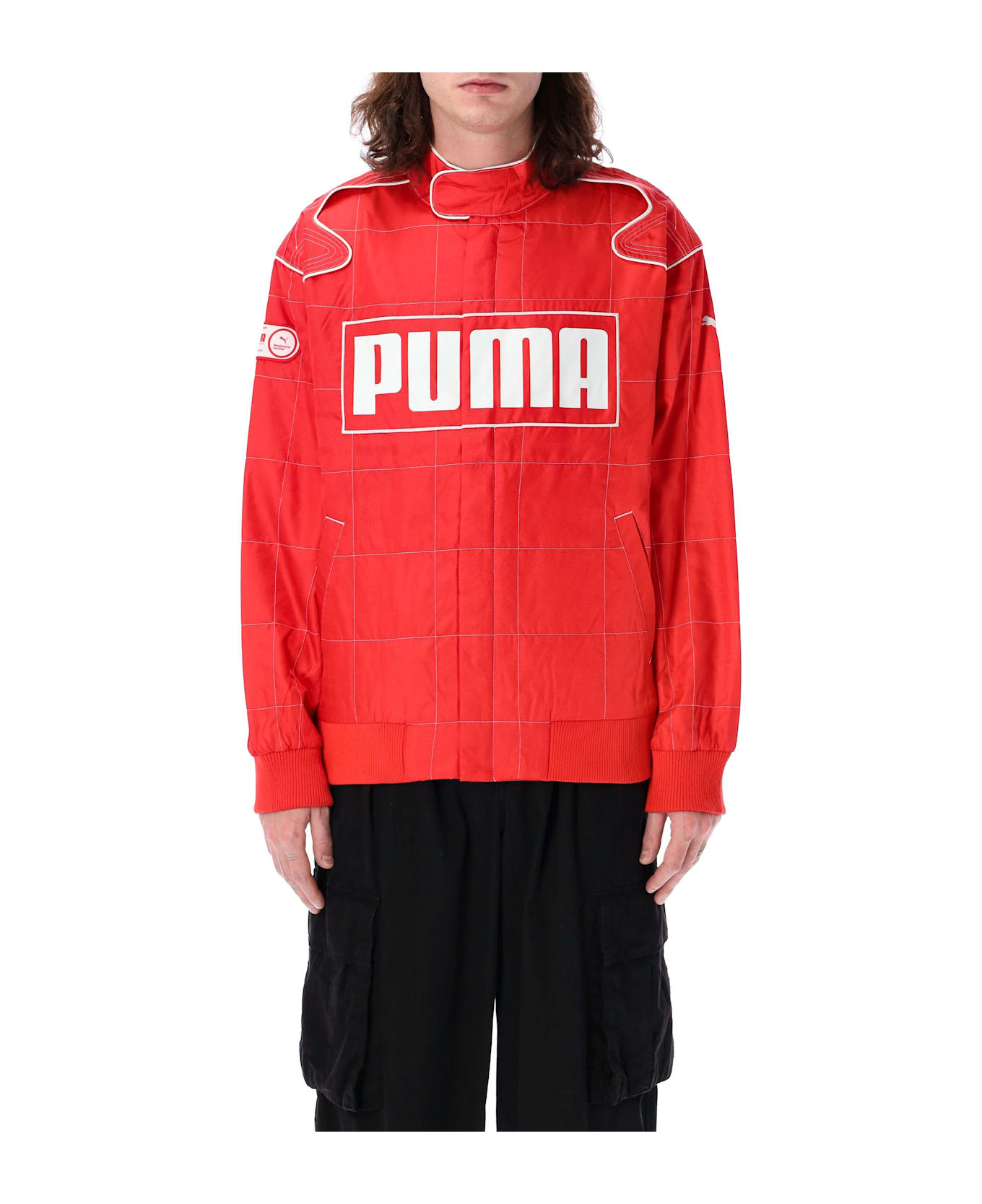 Archive Seasonal Relaxed Racer Jacket By Puma. Featuring: Stand Collar Zip Fastening Logo Print At Front Embroidered Logo At Left Arm Contrast Piping Side Slit Pockets Ribbed Hem And Cuffs Model Is 1,90 M And Wears Size M Composition: 100% recycled polyester Filling, 80% recycled polyester, 20% polyester