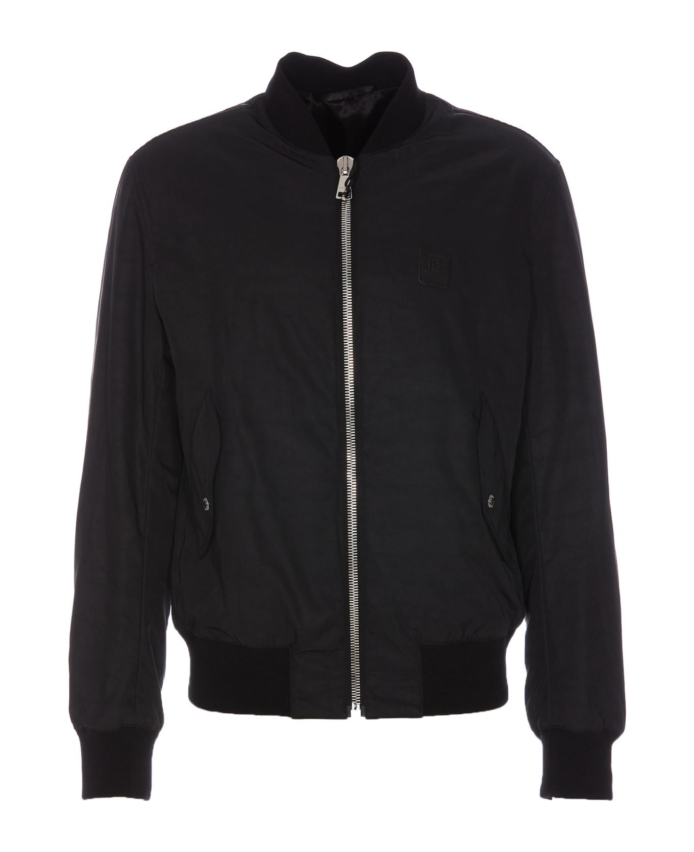 Balmain black jacket with frontal zip closure, pockets with button closure, elasticized cuffs and on waist, frontal patch logo, print tone on tone logo Composition: 100% Polyester, 65% Acetate, 35% Viscose