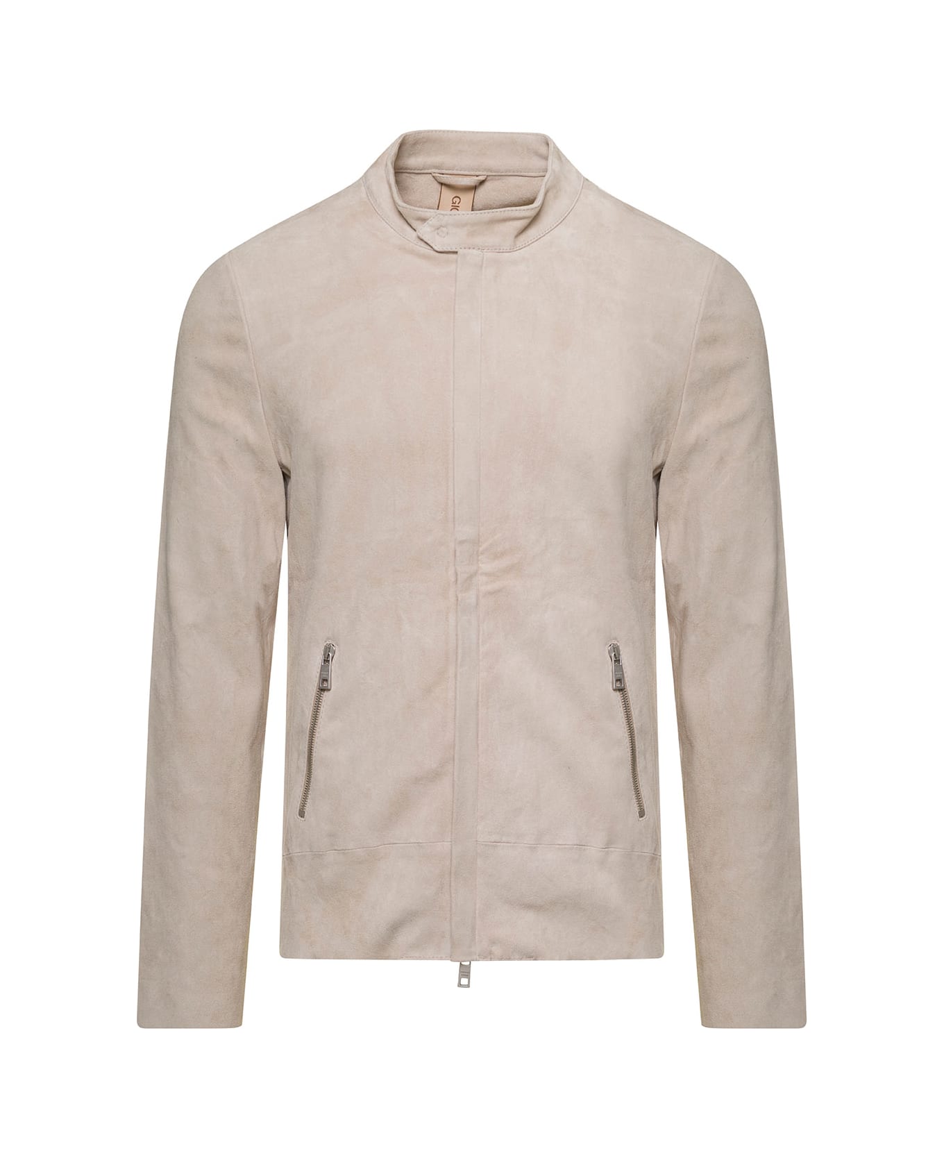 Beige Crewneck Jacket With Zip Fastening In Suede Man