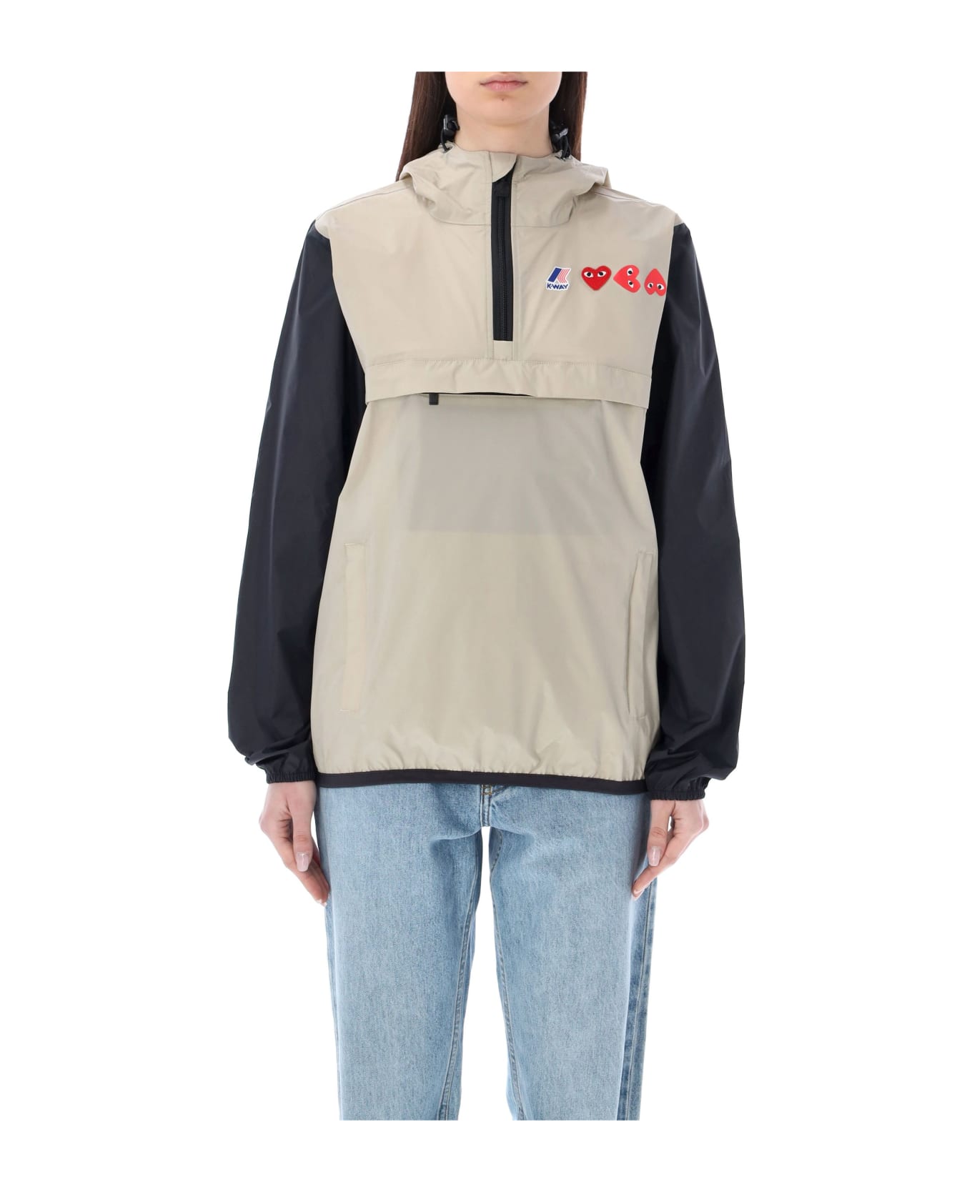 Bicolor Waterproof Hooded Jacket By Comme Des Garçons Play X K-way. Featuring: Half-zip At Front Adjustable Drawstring Hood Kway Logo Print Signature Red Heart Patch And Two Red Hearts Print Hidden Zip Pocket At Chest Two Hidden Zip Pockets At Hips Contrasting Long Sleeves Elastic Cuffs And Hem Model Is 1,72 M Tall And She Is Wearing Size S Model Is 1,90 M Tall And He Is Wearing Size L
