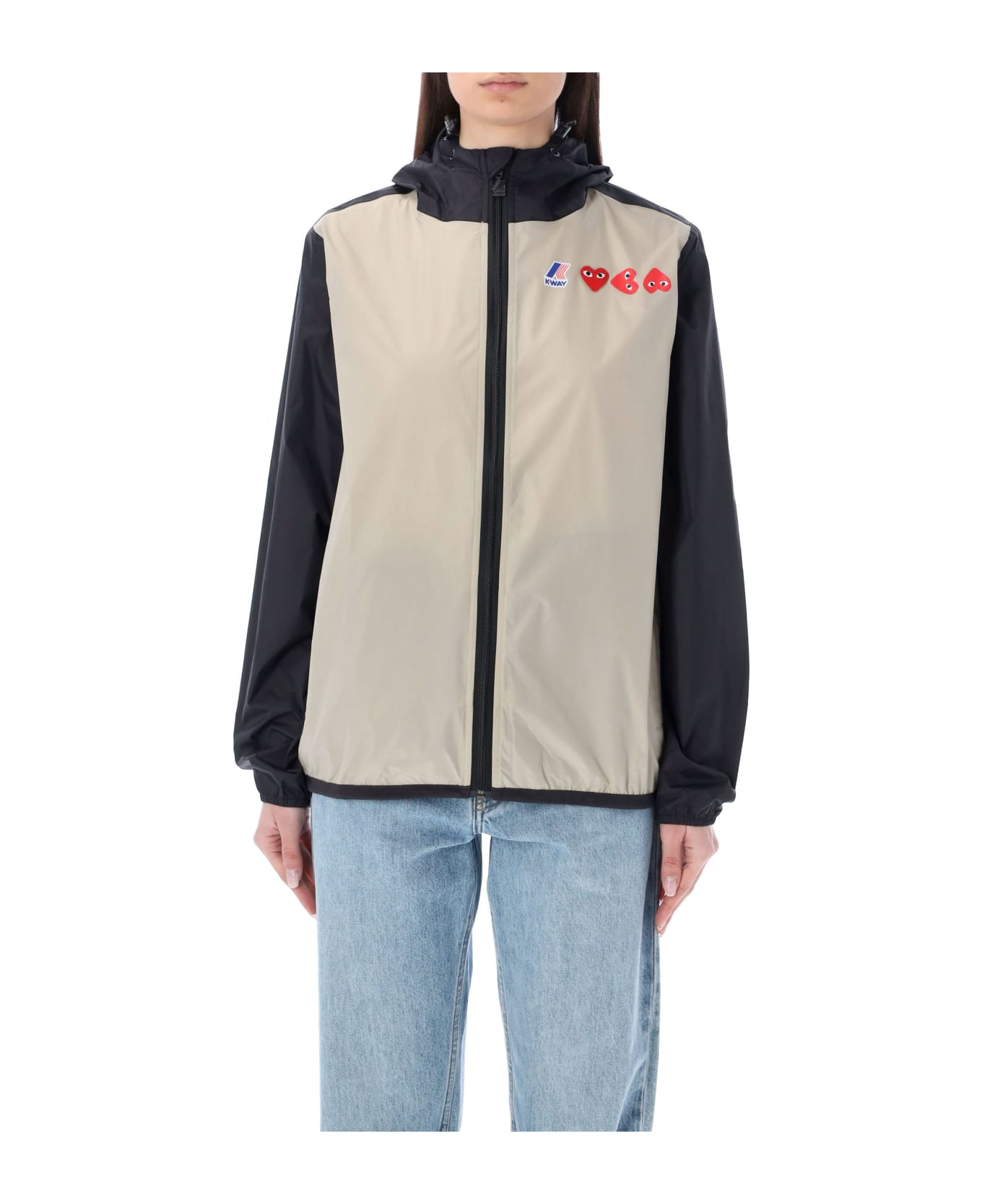 Bicolor Waterproof Zip Jacket With Hood By Comme Des Garçons Play X K-way. Featuring: Full Zip Fastening Adjustable Drawstring Hood Kway Logo Print Signature Red Heart Patch And Two Red Hearts Print Two Hidden Zip Pockets At Hips Long Sleeves Elastic Cuffs And Hem Model Is 1,72 M Tall And She Is Wearing Size S Model Is 1,90 M Tall And He Is Wearing Size L