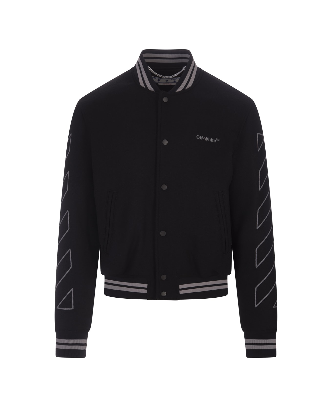 Off-White padded bomber jacket in black wool blend with logo embroidery on the chest. The model features a press stud fastening, long sleeves with Diag Helvetica embroidery, two front pockets and elasticated knitted ribbed edges with a striped pattern.