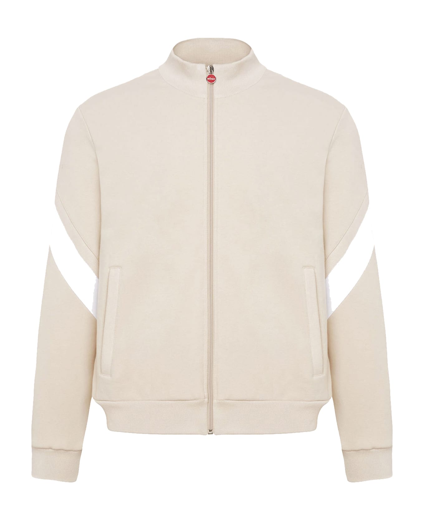 Fleece-style jacket in beige with white band details, made from luxurious cotton jersey. The breathable, easy-care fabric is extremely lightweight and comfortable, while the inner gauzing makes it warm for winter. The jacket features a front zip fastening and two vertical pockets. Embroidery detail with logo on the back. The collar, lower hemline and cuffs are characterised by plain rib knitting. The garment has been cut, assembled and sewn in our manufacturing facility in Collecchio thanks to technical processes that give it a sartorial soul. To maintain the beauty of your Kiton garment, we recommend professional laundering and pressing.