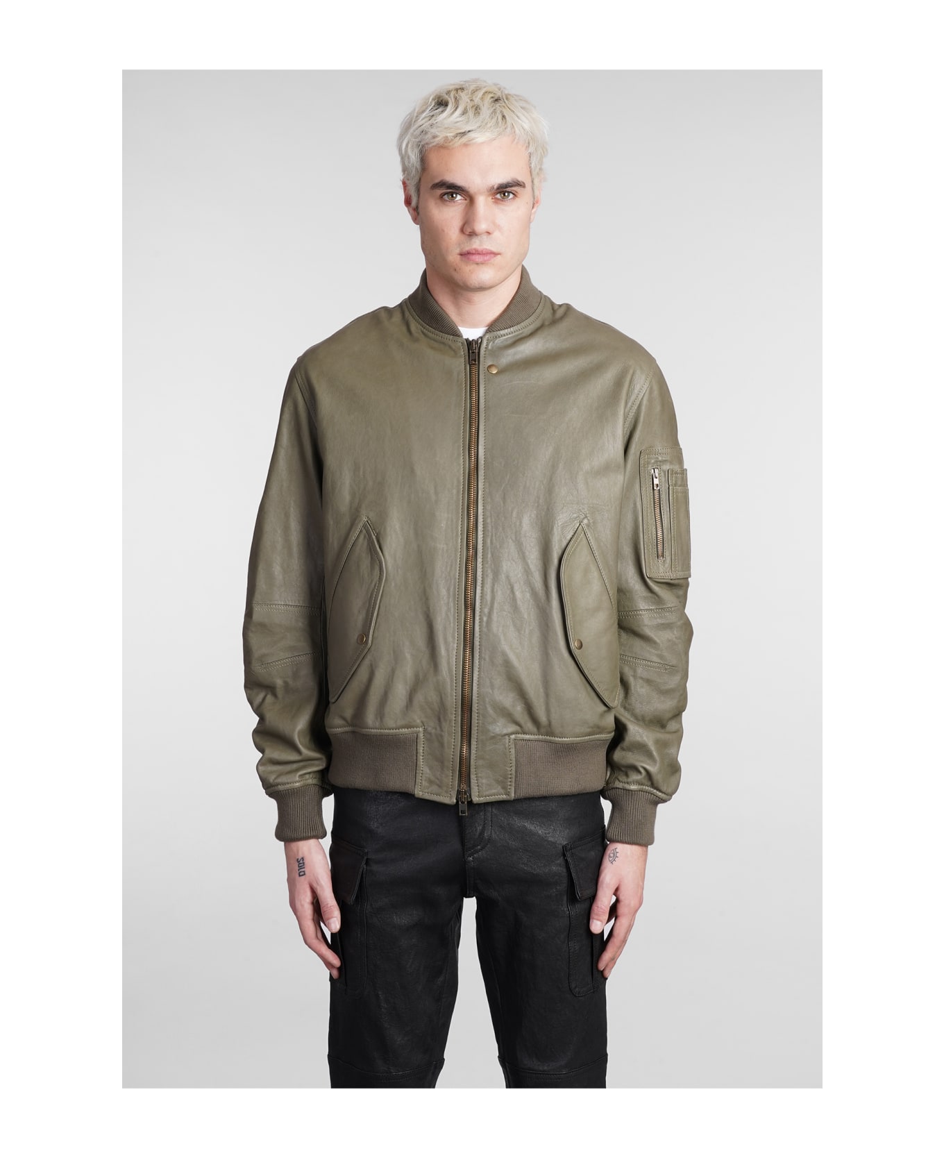 Bomber in green leather, bomber collar, zip clousure, long sleeves, pockets, 100% ovine leather, Model is 183 cm and wears 48