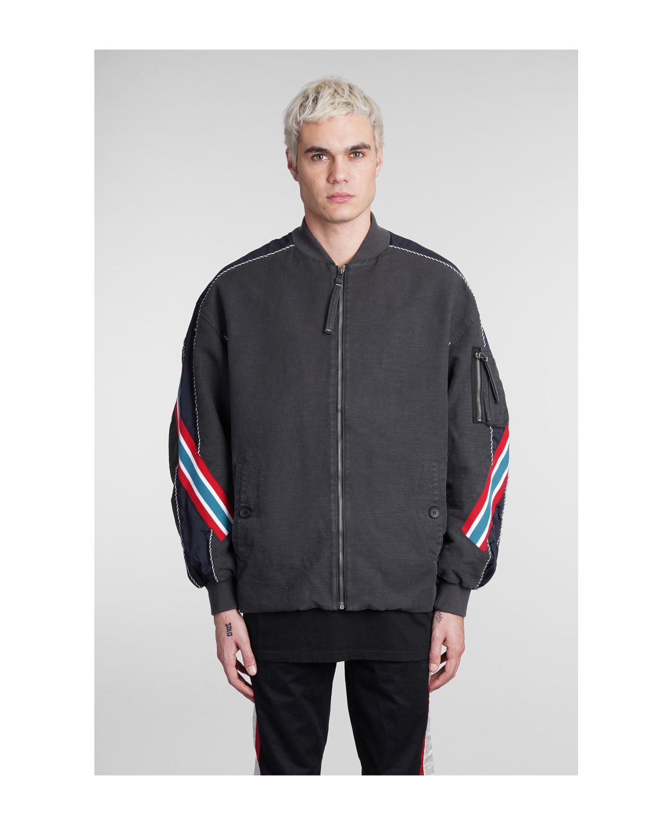 Bomber in grey polyester, zip clousure, bomber collar, elasticized cuff and bottom, pockets on side, contrasting bands, zip detail long sleeve, 100% cotton, Made in Italy
