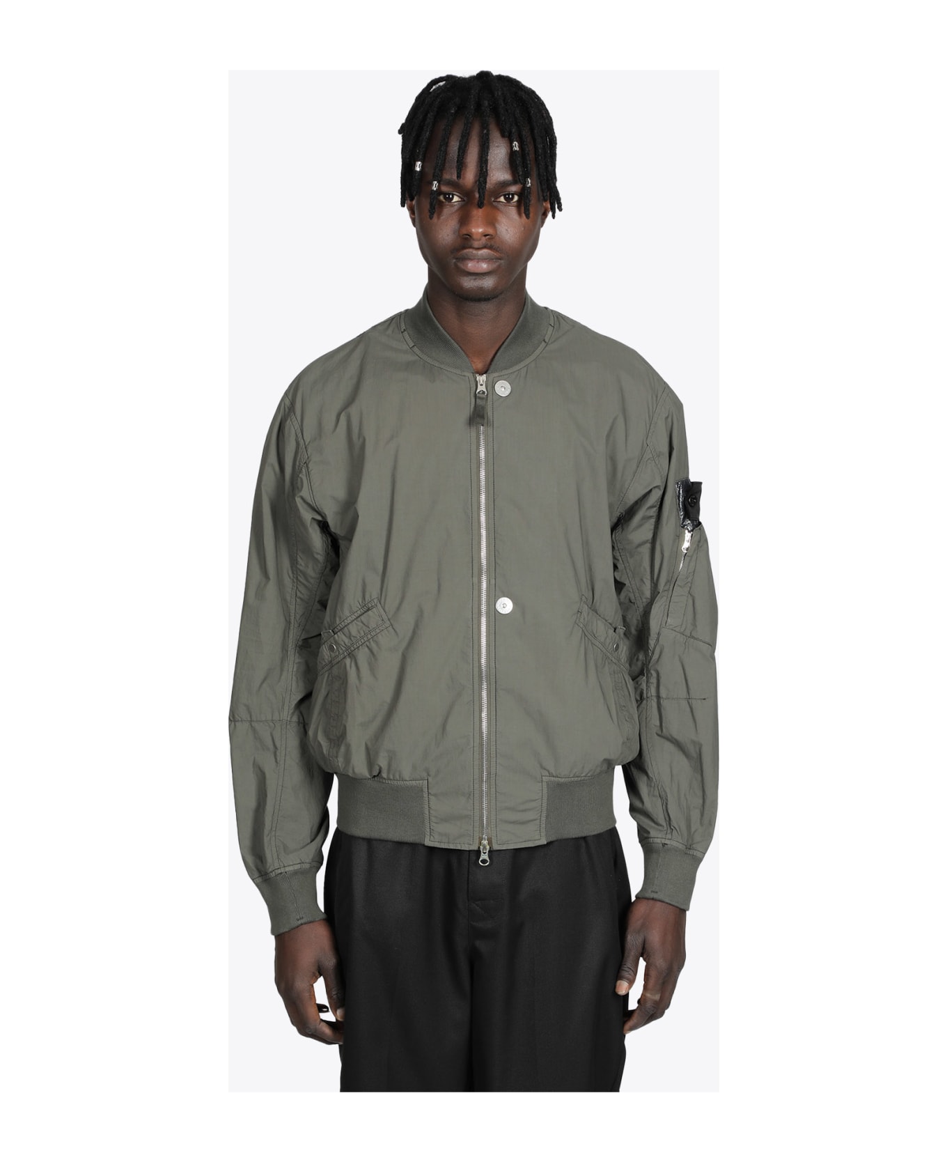 Military green cotton bomber jacket, metal zip closure, front flap in glass linen with metal snap closure, two side pockets with snap closure, rib-knit collar, cuffs and bottom hem, sleeve pocket with metal zip and hidden Stone Island Shadow Project badge, back horizontal bottom vent revealing the inner cooling cotton mesh lining, regular fit. The model is 185 cm and wears size M. Composition: 100% cotton. Made in Italy.